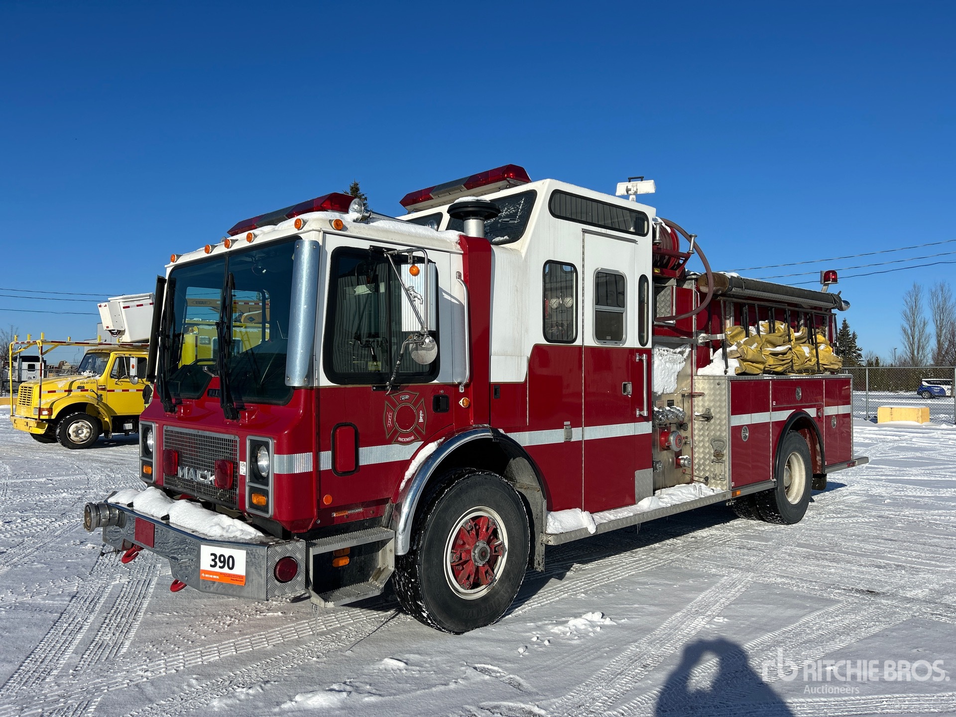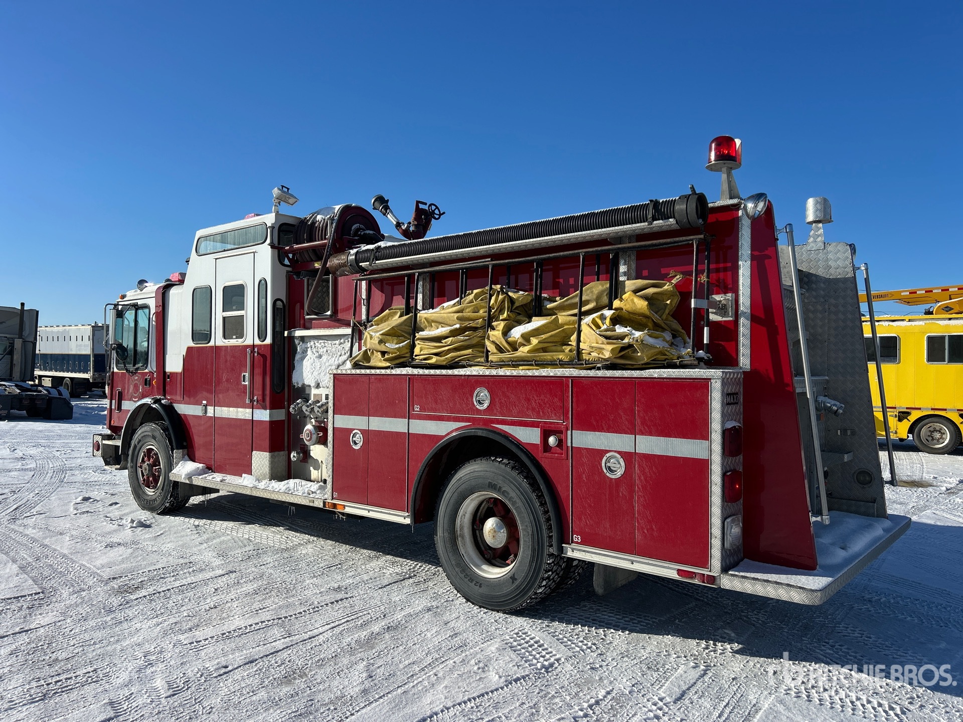 Located in Lane 10 Spot 27, 3806 Engine hrs, Retarder, Allison Automatic Transmission, 18000 lb Front Axle, 23000 lb Rears, 18600 kg GVWR, Mack E7 6 Cylinder Diesel 300 hp Engine, 1995 US EPA Label, 315/80R22.5 Front Tires, 12R22.5 Rear Tires, Spring Suspension, 198 in Wheelbase, Maxi-Metal 23 ft Body, Darley Champion 6 in PTO Driven Pump