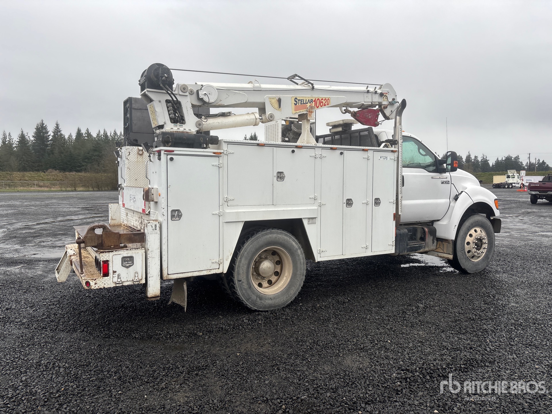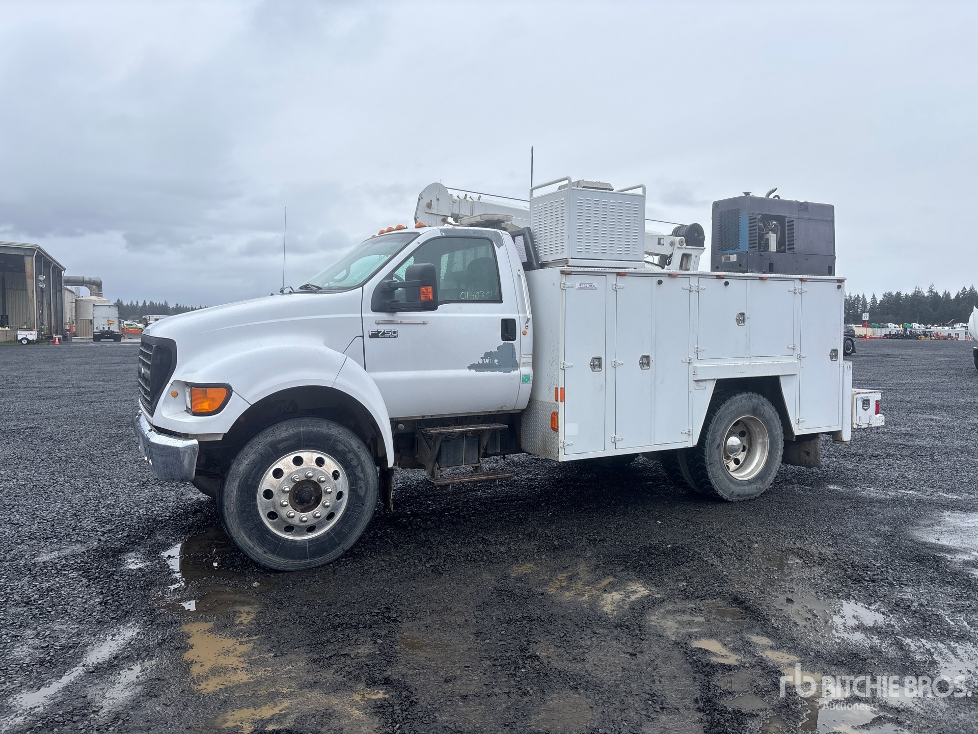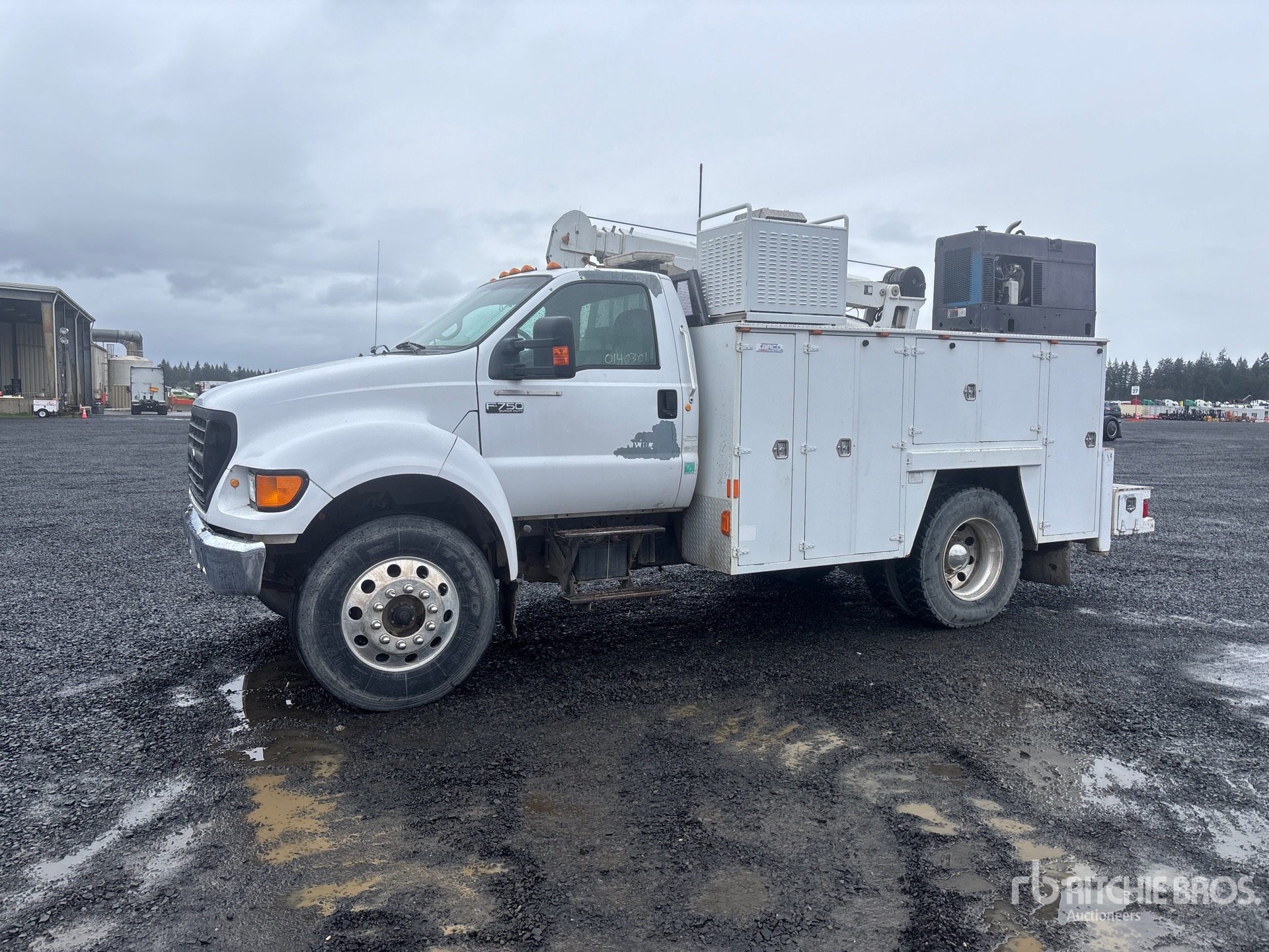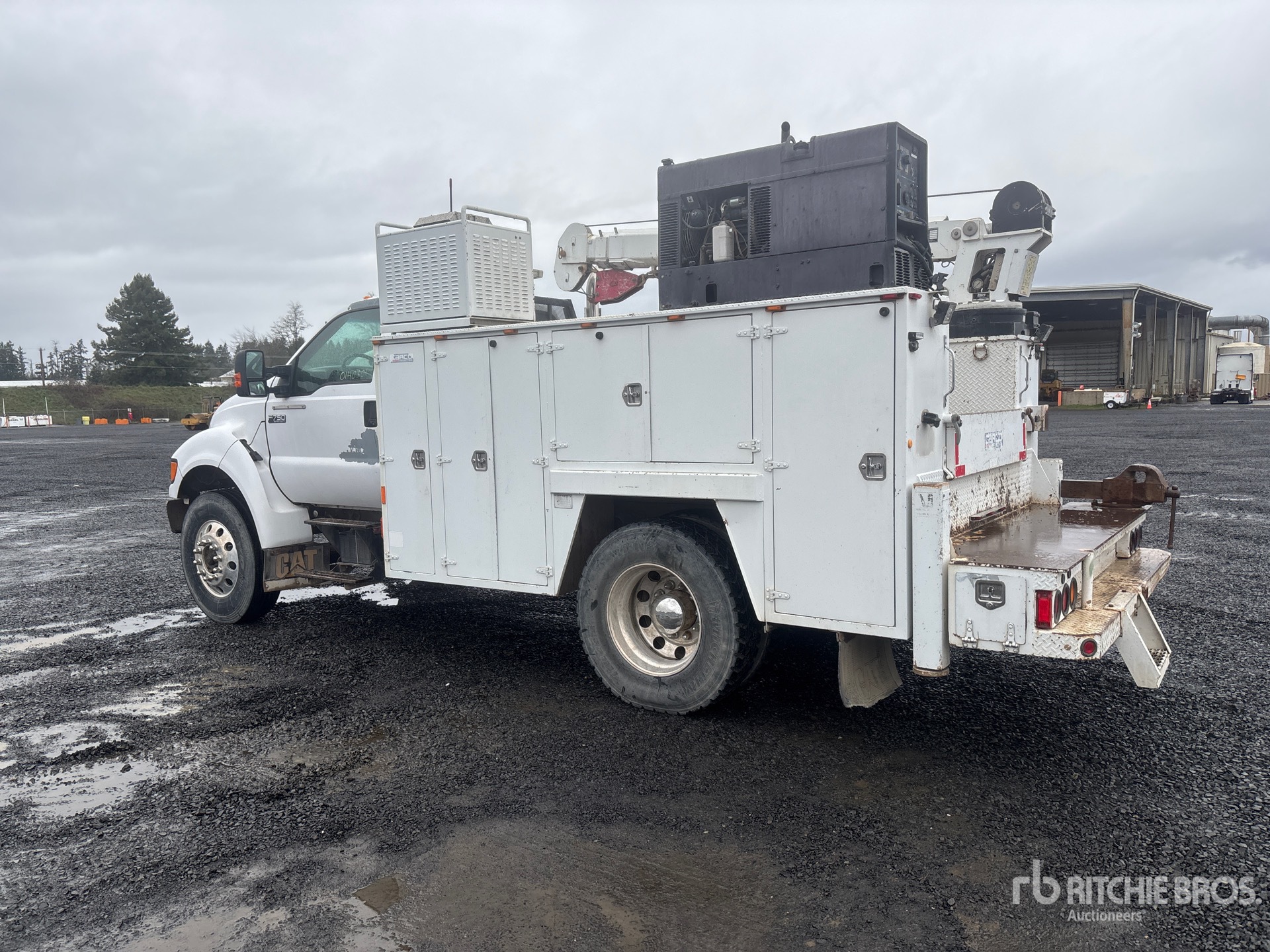 Located in Lane 9 Spot 8, Cat 3126 6 Cylinder 7.2 L Diesel Engine, 2002 US EPA Label, 6-Speed Manual Transmission, 12000 lb Front Axle, 21000 lb Rears, 33000 lb GVWR, Aluminum Outer Wheels, 11R22.5, Spring Suspension, 194 in Wheelbase, PTO, 2003 Carco MB011-301 11 ft Body, Hydraulic Stabilizers, Stellar 10620 10000 lb 3 Section Hydraulic Crane, Wireless Remote Control, Hydraulic Air Compressor, Air Hose Reel, Miller Bobcat 250D 10 kW 250 A Gasoline Welder