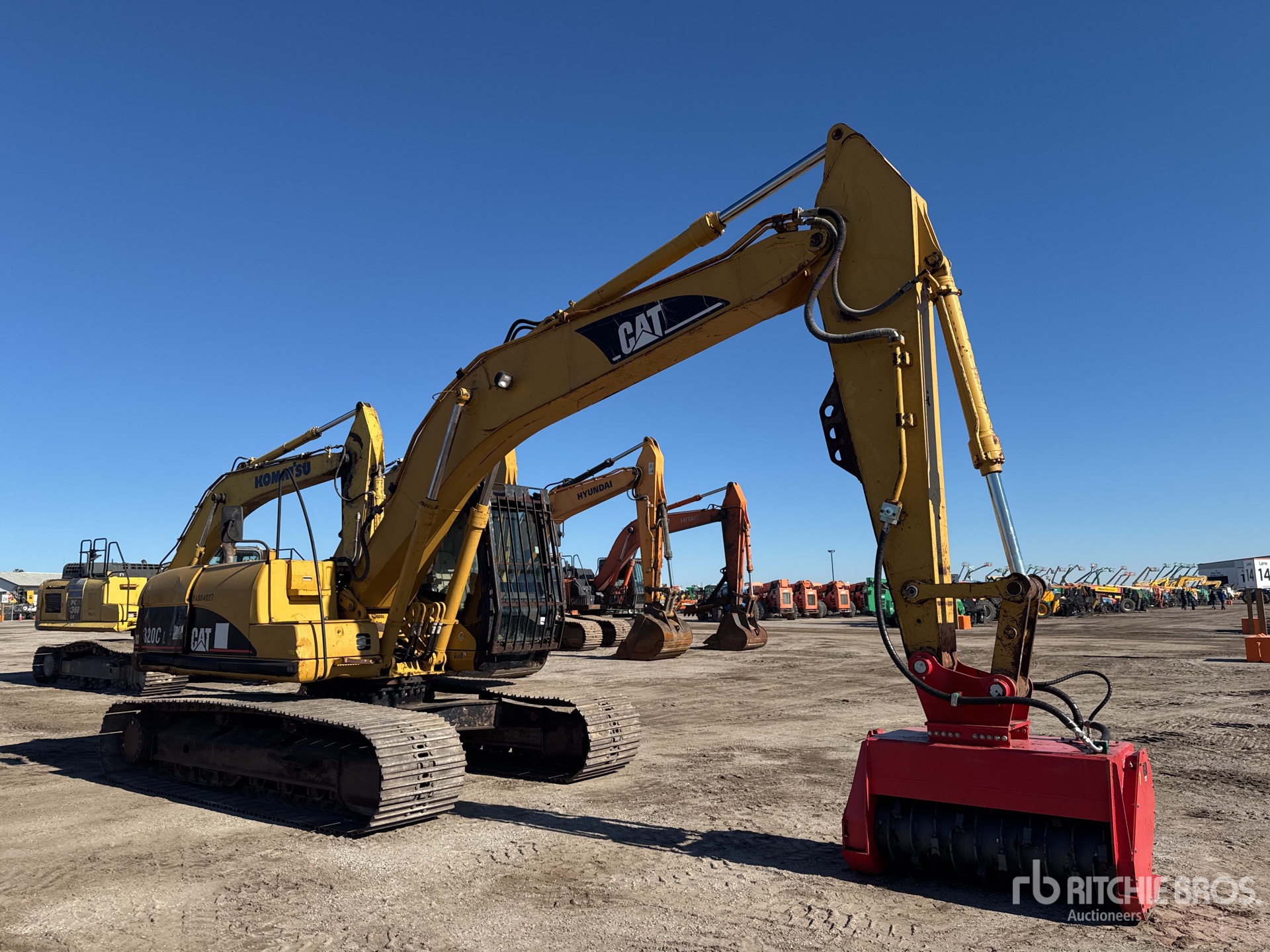 Air Conditioner, Straight Travel Pedal, 9 ft 6 in Stick, Auxiliary Hydraulic Plumbing, 31.5 in Triple Grouser Track Shoes, Raytree REDM50 Drum mulching head
