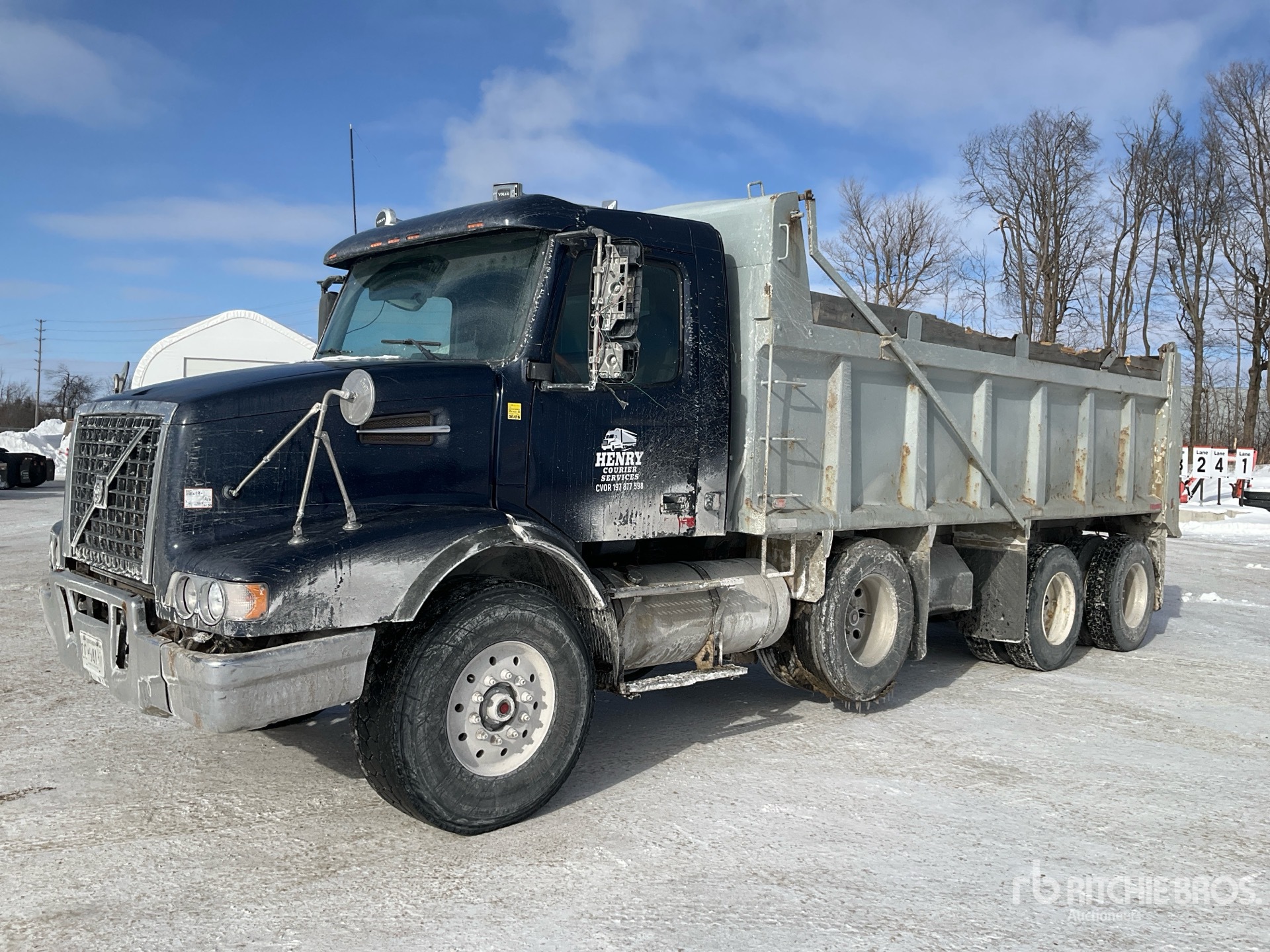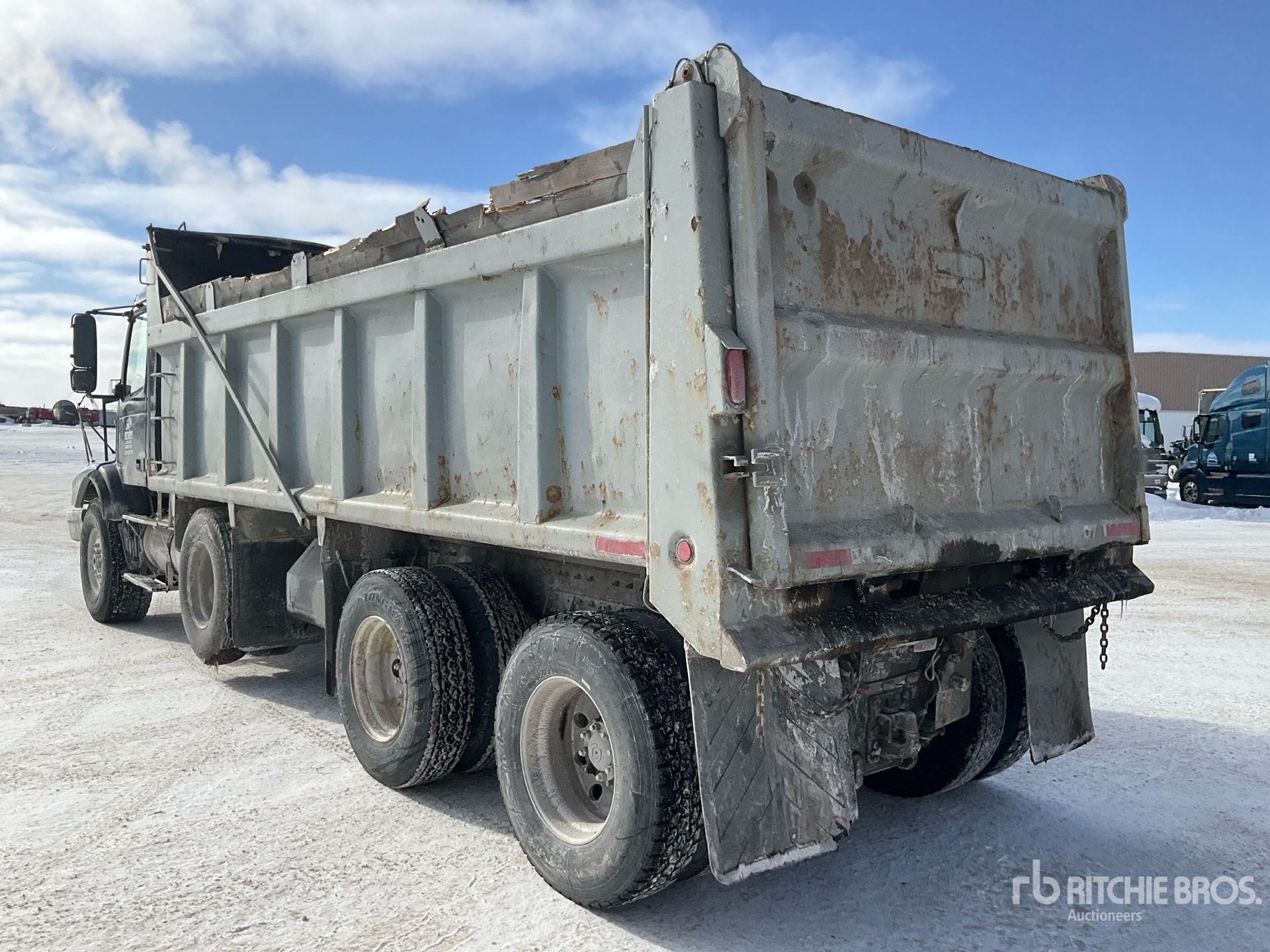 Volvo D12D465 6 Cylinder Diesel 465 hp Engine, 29065 Engine hrs, Engine Brake, Eaton Fuller RTLO-16918B Manual Transmission, Differential Lock, 20000 lb Front Axle, 46000 lb Rears, 4.30:1 Axle Ratio, 83761 lb GVWR, 425/65R22.5 Front Tires, 11R22.5 Rear Tires, Dual Steering Boxes, Double Frame, Hendrickson Walking Beam Suspension, PTO, 20 ft 6 in Long x 4 ft High Steel Body, Air Powered Roll Tarp, Rear Hydraulics, Pintle Hitch
