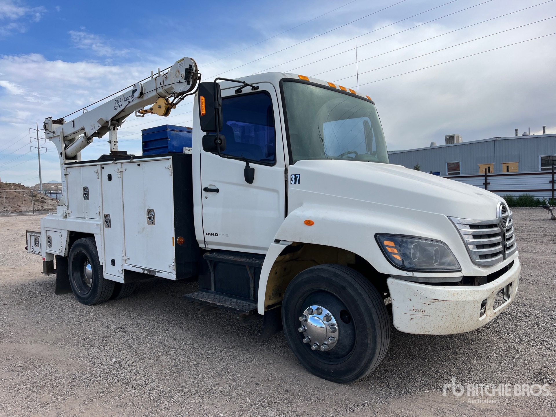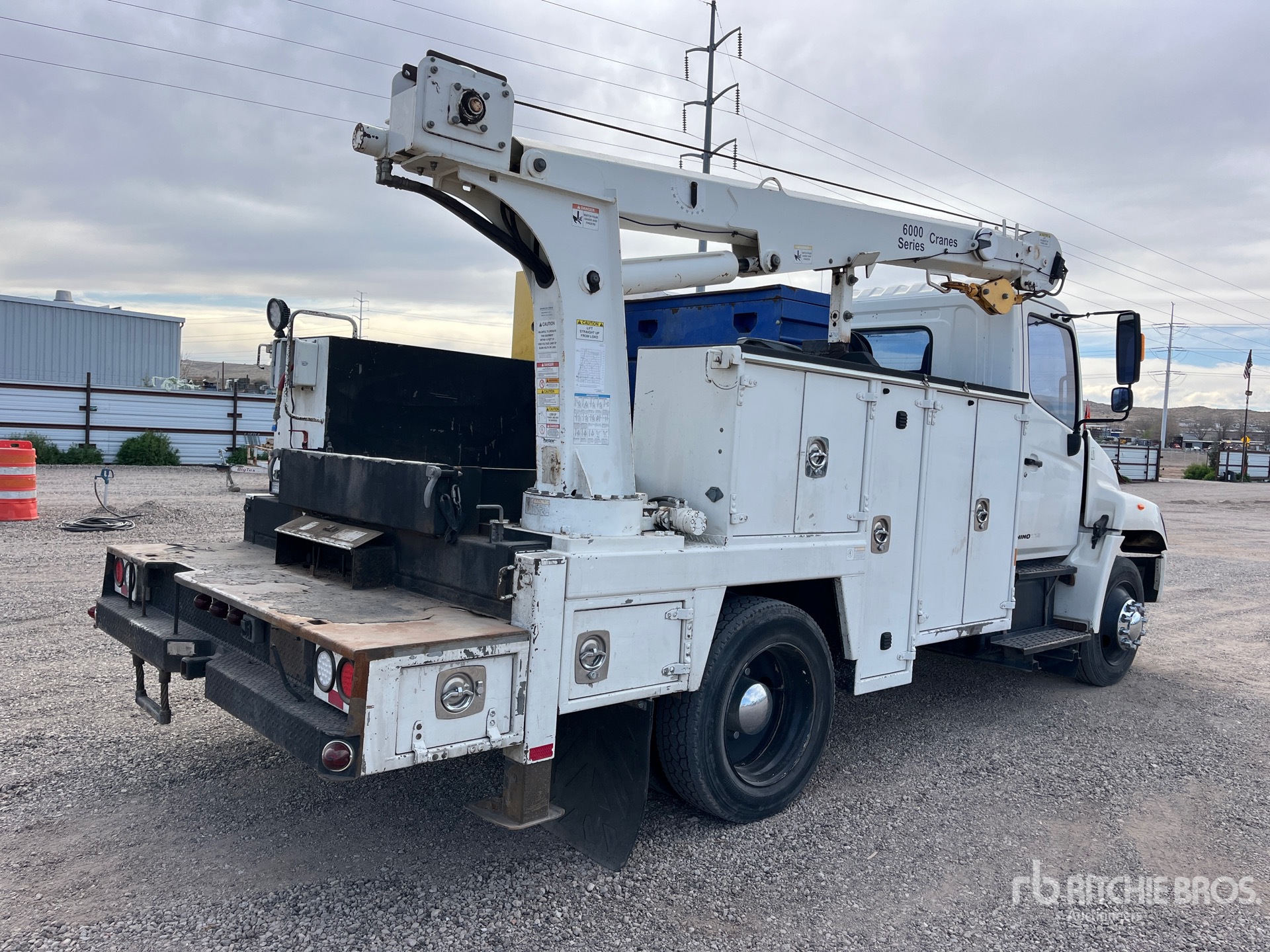 Hino J08E-TA 6 Cylinder 469 cid Diesel 220 hp Engine, 2005 US EPA Label, Automatic Transmission, 255/70R22.5, Spring Suspension, 153 in Wheelbase, 11 ft Body, Hydraulic Stabilizers, Maintainer 6000 series 3 Section Hydraulic Crane, Ingersoll-Rand VHP40RMH 40 cfm Hydraulic Air Compressor, Air Hose Reel