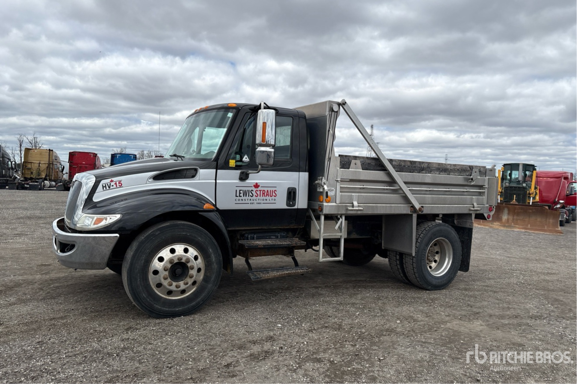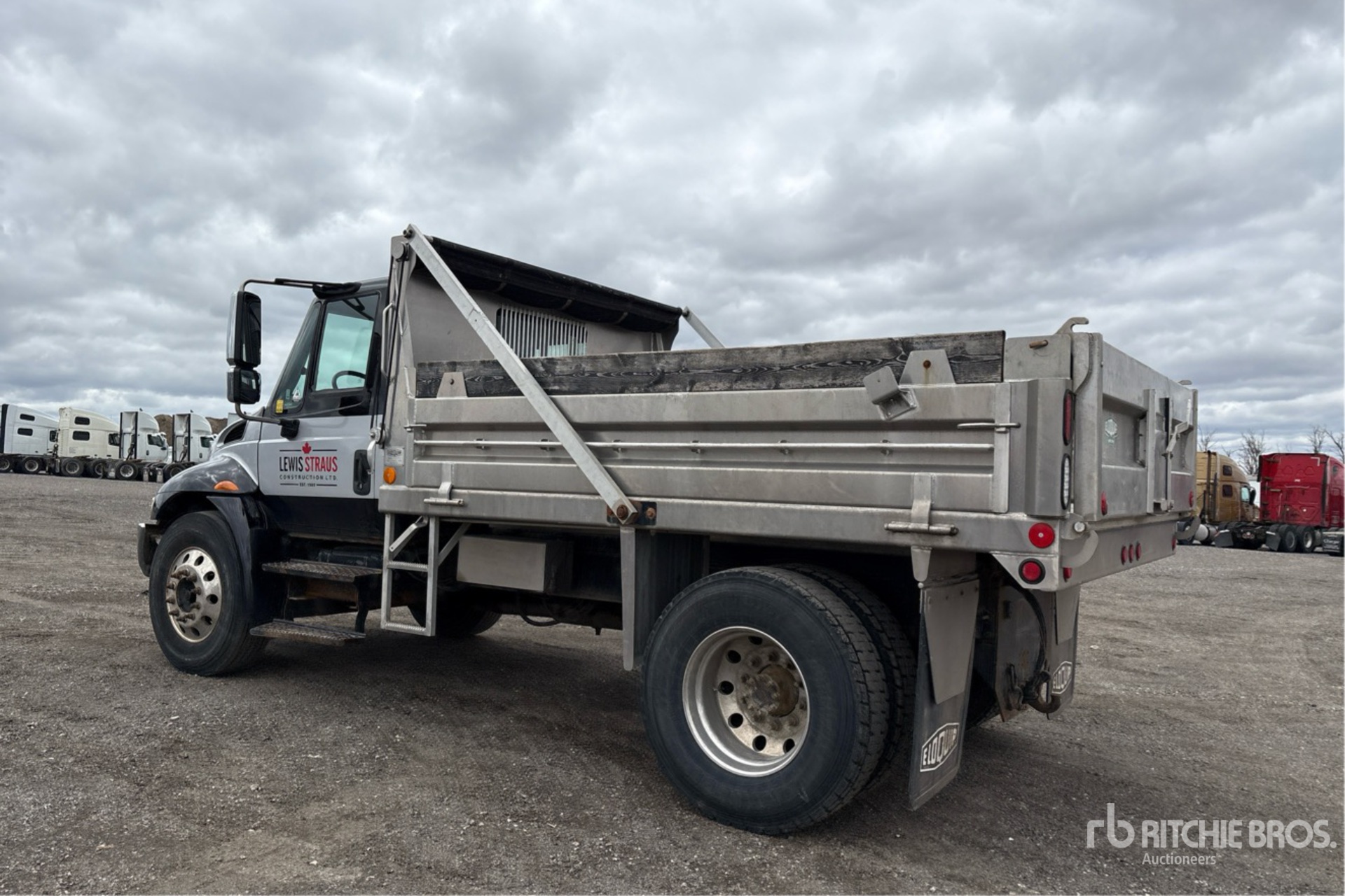 International 6 Cylinder 7.6 L Diesel 210 hp Engine, 2005 US EPA Label, CARB Compliant, 12659 Engine hrs, Automatic Transmission, 3632 kg Front Axle, 7945 kg Rears, 11577 kg GVWR, Aluminum Wheels, 11R22.5 Front Tires, 11R22.5 Rear Tires, Spring Suspension, 159 in Wheelbase, PTO, Eloquip 11 ft 3 in Long x 2 ft High Aluminium Body, Manual Roll Tarp, Pintle Hitch