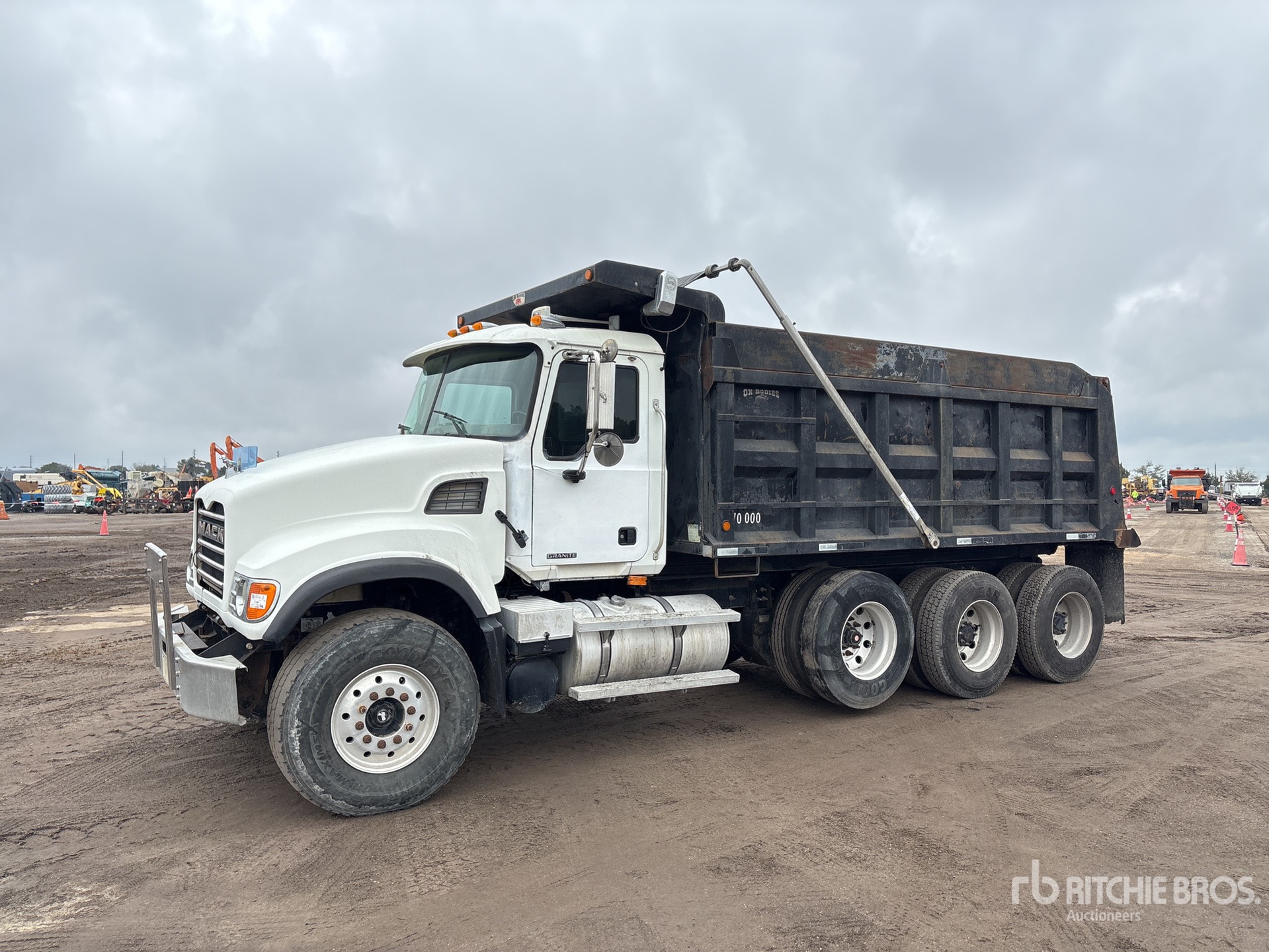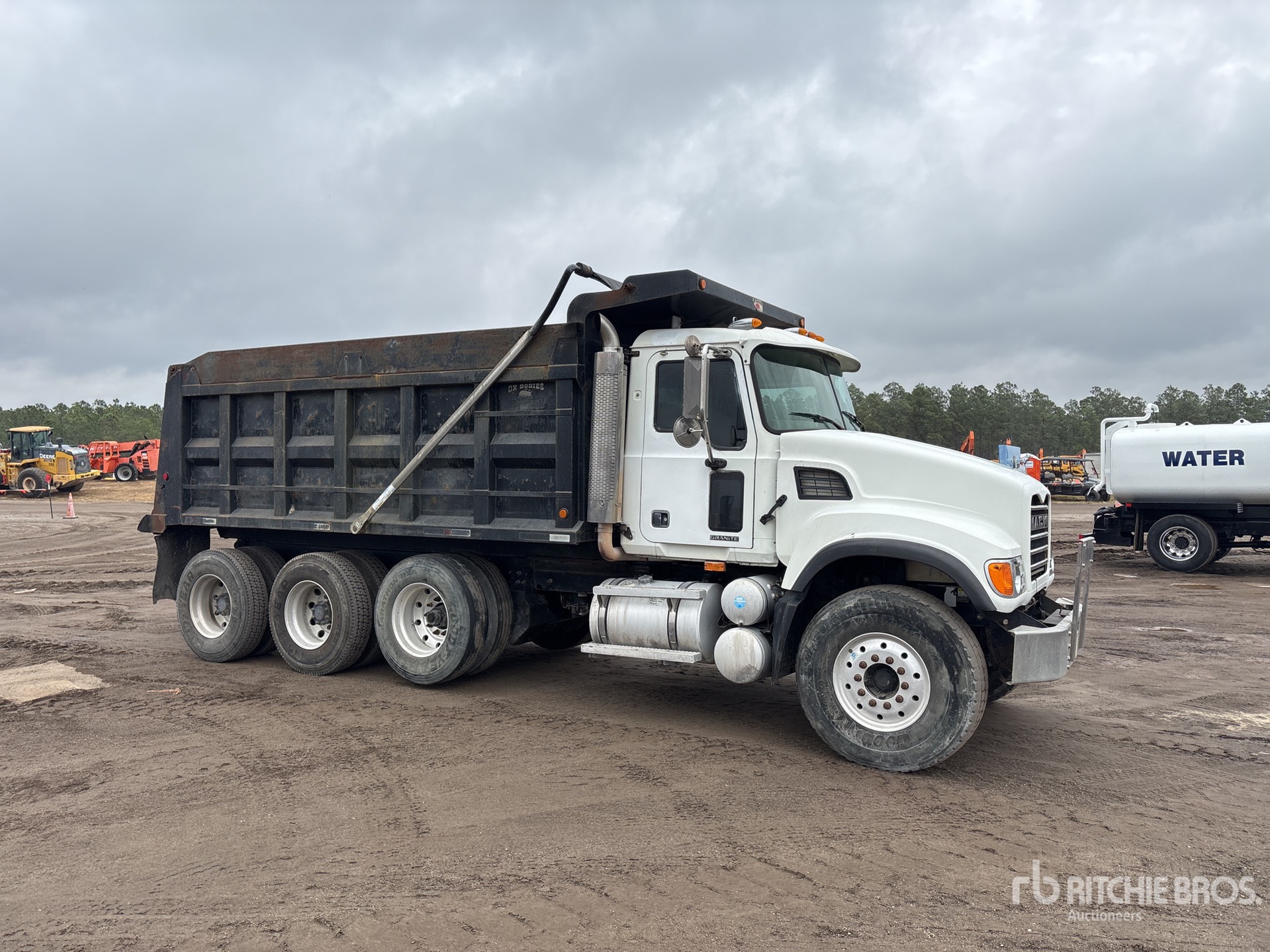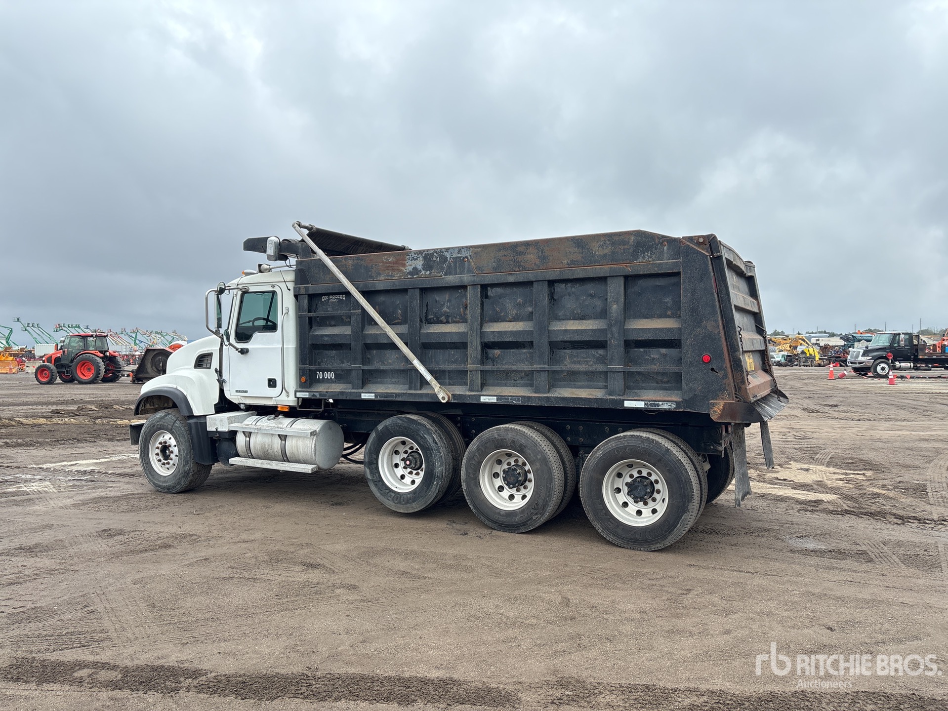 Located in Lane 55 Spot 1, Mack 6 Cylinder Diesel Engine, 24687 Engine hrs, Manual Transmission, 18000 lb Front Axle, 44000 lb Rears, 62000 lb GVWR, Aluminum Outer Wheels, 425/65R22.5 Front Tires, 11R22.5 Rear Tires, Air Lift Pusher Axle, Double Frame, Camelback Suspension, 222 in Wheelbase, PTO, OX Bodies 16 ft Long x 4 ft 4 in High Steel Body, Electric Roll Tarp