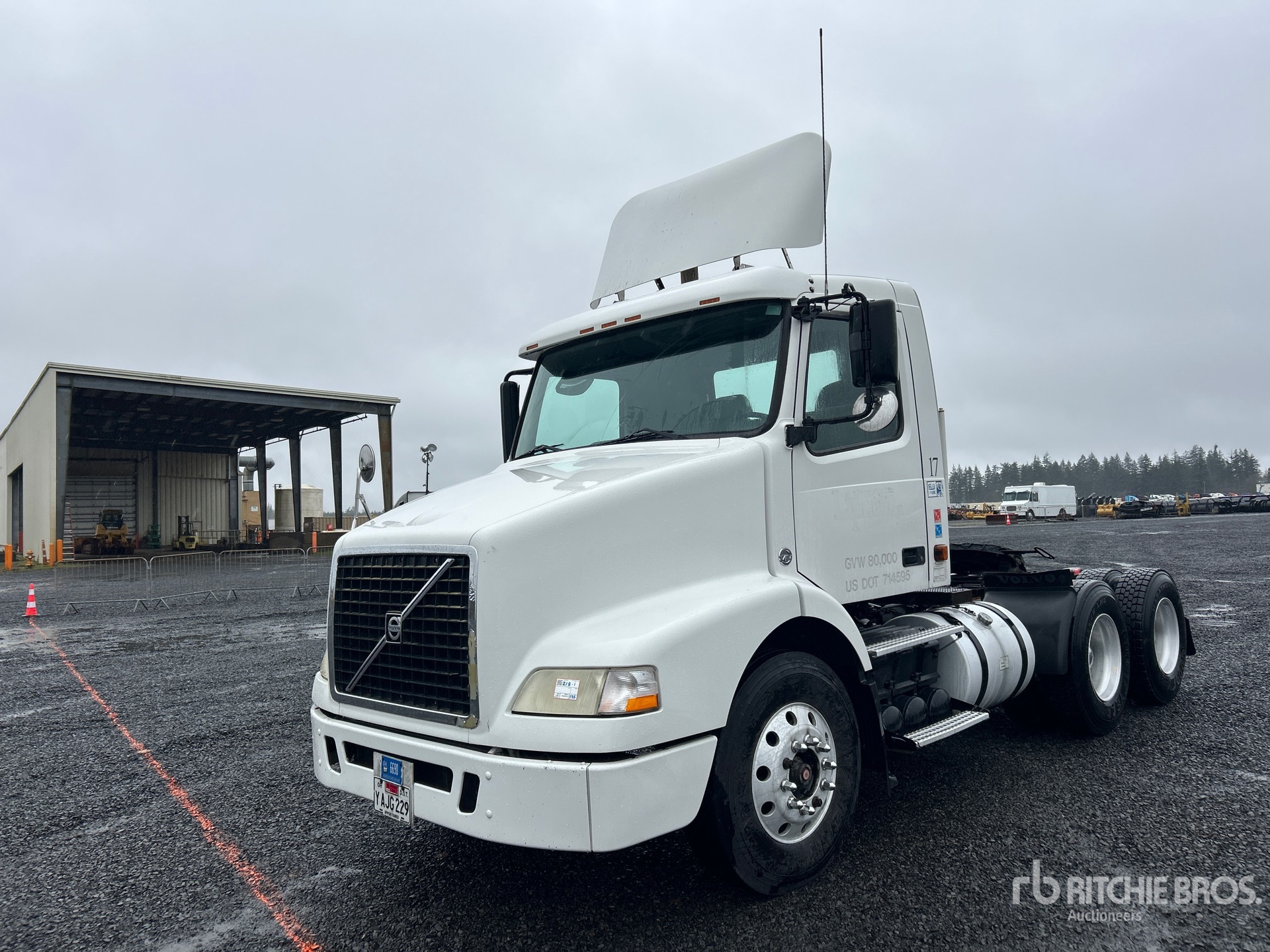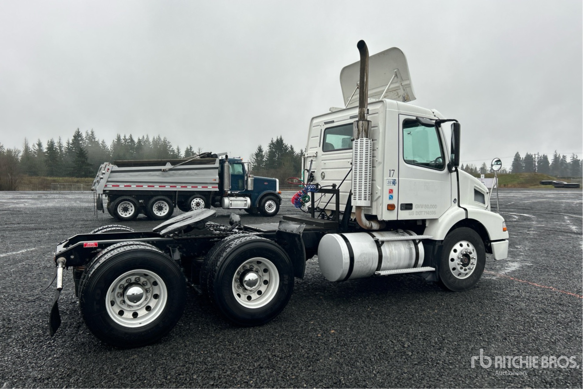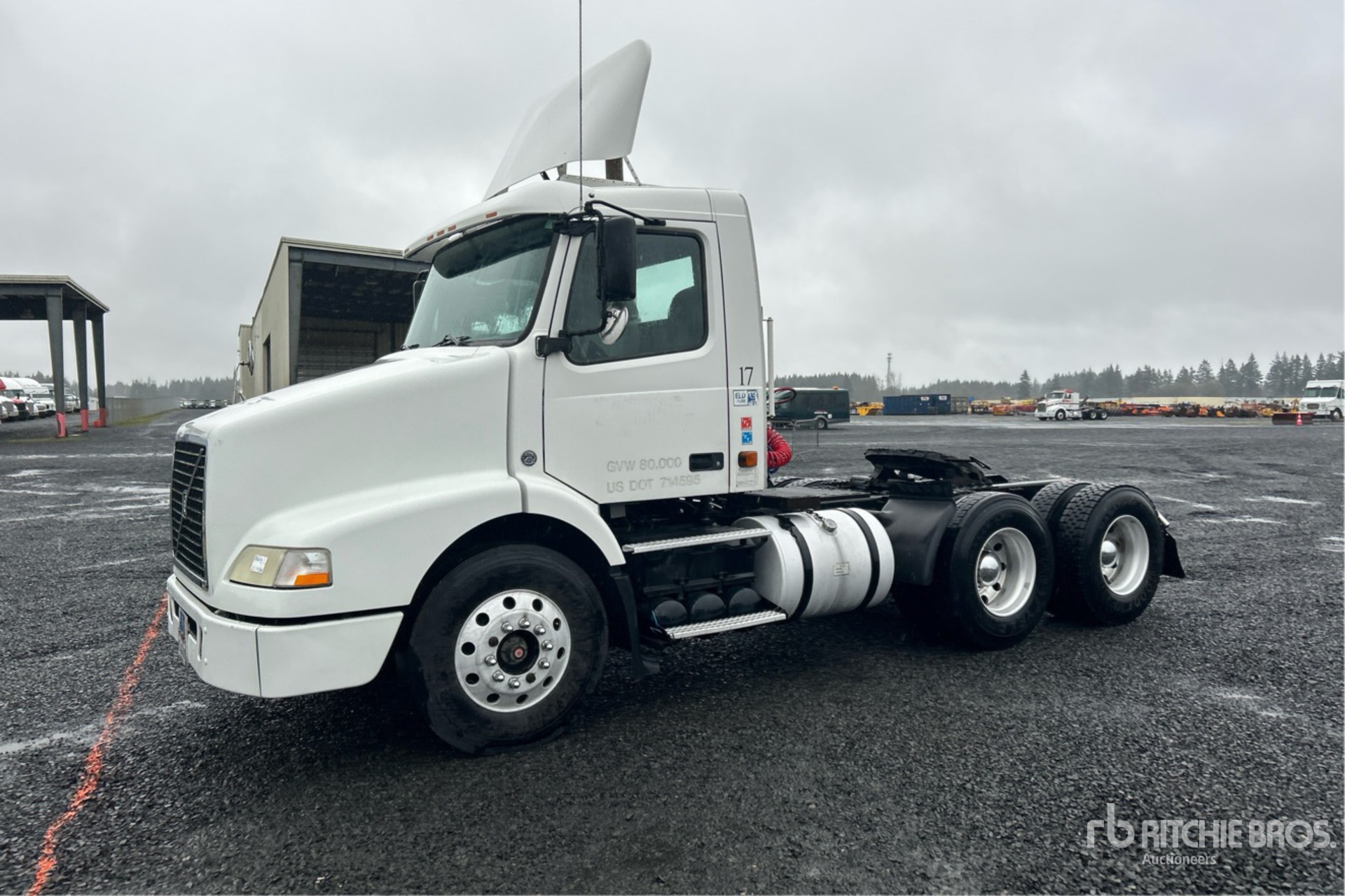 Located in Lane 14 Spot 2, Volvo D12D 435 hp Engine, 2006 US EPA Label, 24081 Engine hrs, Eaton Fuller FRO-15210B 10-Speed Manual Transmission, 12350 lb Front Axle, 38000 lb Rears, 50350 lb GVWR, Engine Brake, 164 in Wheelbase, Air Suspension, Aluminum Outer Wheels, 11R22.5, Air Sliding 5th Wheel, Dual Fuel Tanks
