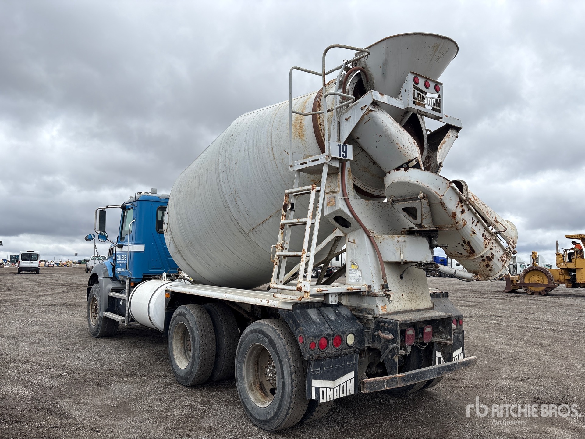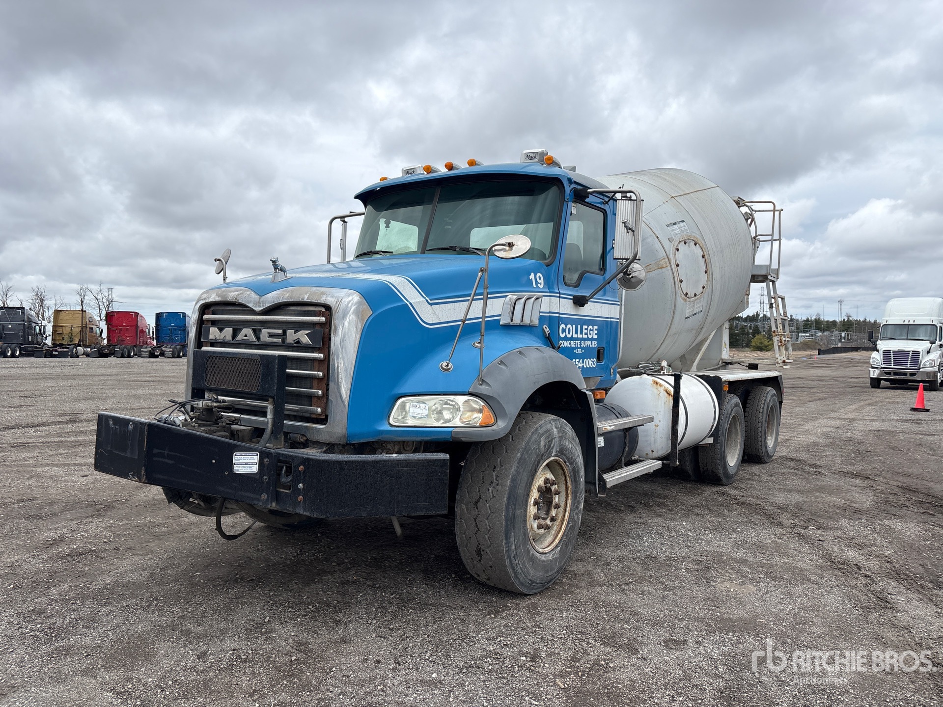 Mack MP7 6 Cylinder Diesel Engine, 16502 Engine hrs, Eaton Fuller 8-Speed Manual Transmission, Differential Lock, 9072 kg Front Axle, 20866 kg Rears, 29938 kg GVWR, 425/65R22.5 Front Tires, 11R22.5 Rear Tires, Dual Steering Boxes, Rubber Suspension, PTO, London 14 cyd Mixer Unit, Cordless Remote Control