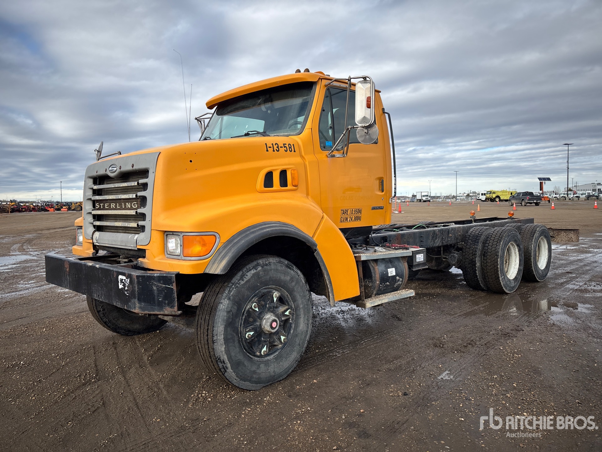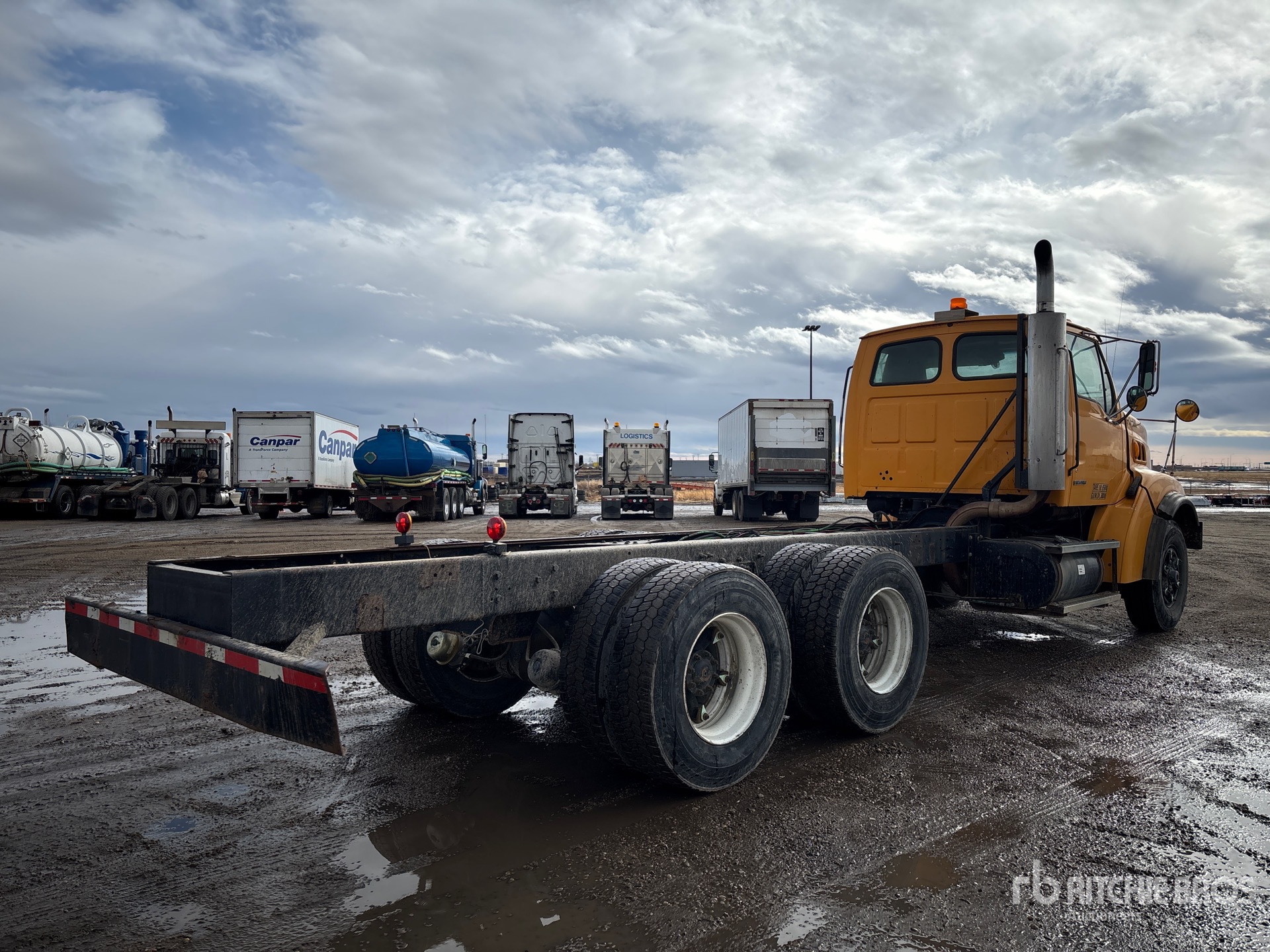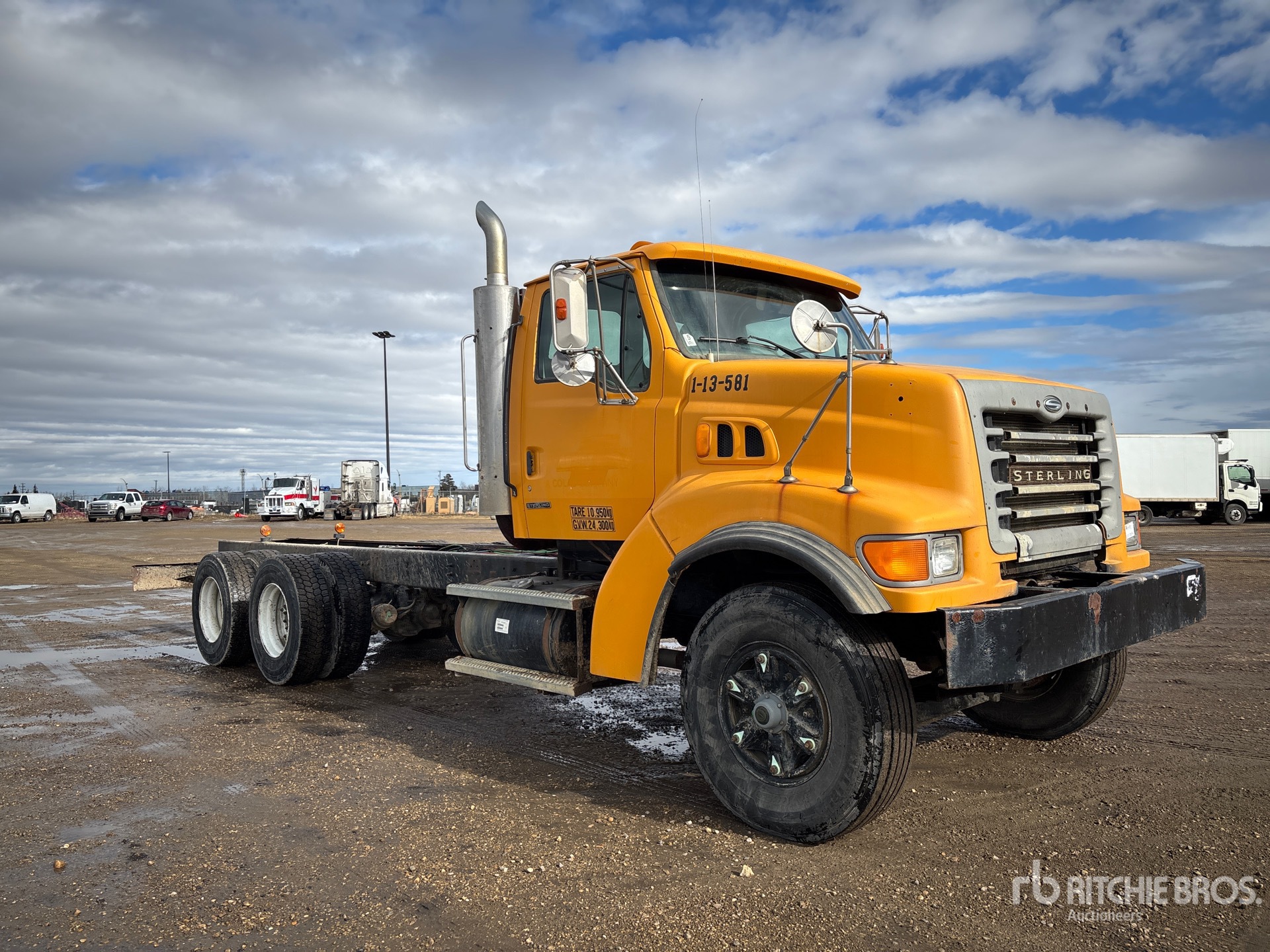 Cat C12 6 Cylinder 12 L Diesel 455 hp Engine, 2000 US EPA Label, 8756 Engine hrs, Engine Brake, Eaton Fuller RTLO-16913A 13-Speed Manual Transmission, 16000 lb Front Axle, 46000 lb Rears, Meritor RT-46-160 Drive Axles, 4.10:1 Axle Ratio, 62000 lb GVWR, 315/80R22.5 Front Tires, 11R22.5 Rear Tires, Double Frame, Hendrickson Rubber over Walking Beam Suspension, 228 in Wheelbase, 174 in Cab to Axle, 250 in Cab to End of Frame