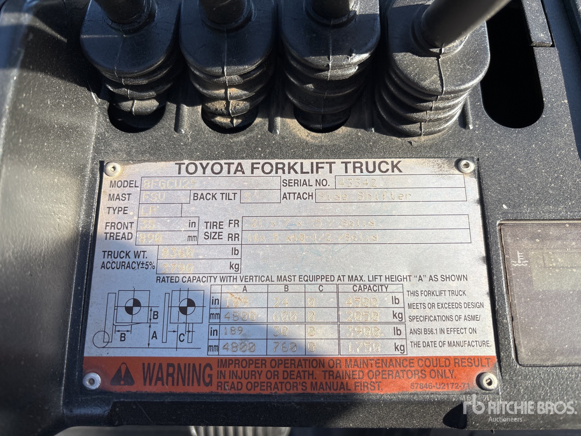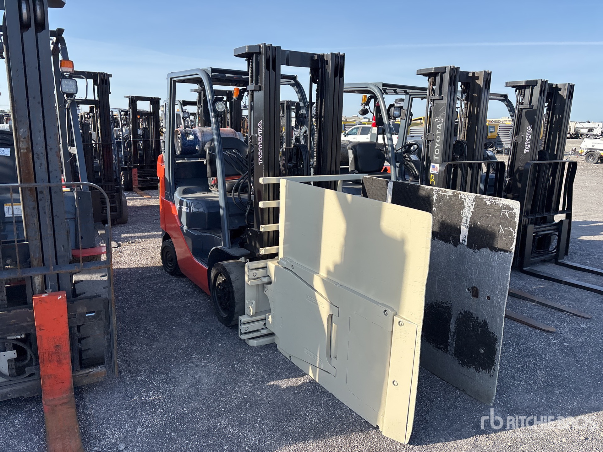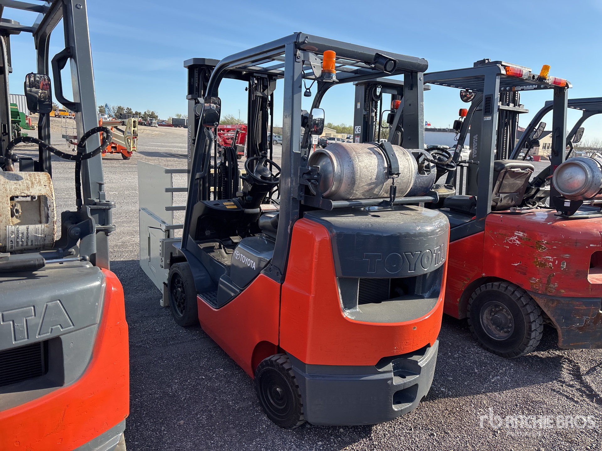 3 Stage Mast, 189 in Max Lift Height, 82 in Lowered Mast Height, Side Shift, Carton Clamp, Solid Pneumatic Tires, 2012 US EPA Label, Toyota 4 Cylinder 2.2 L LPG Engine