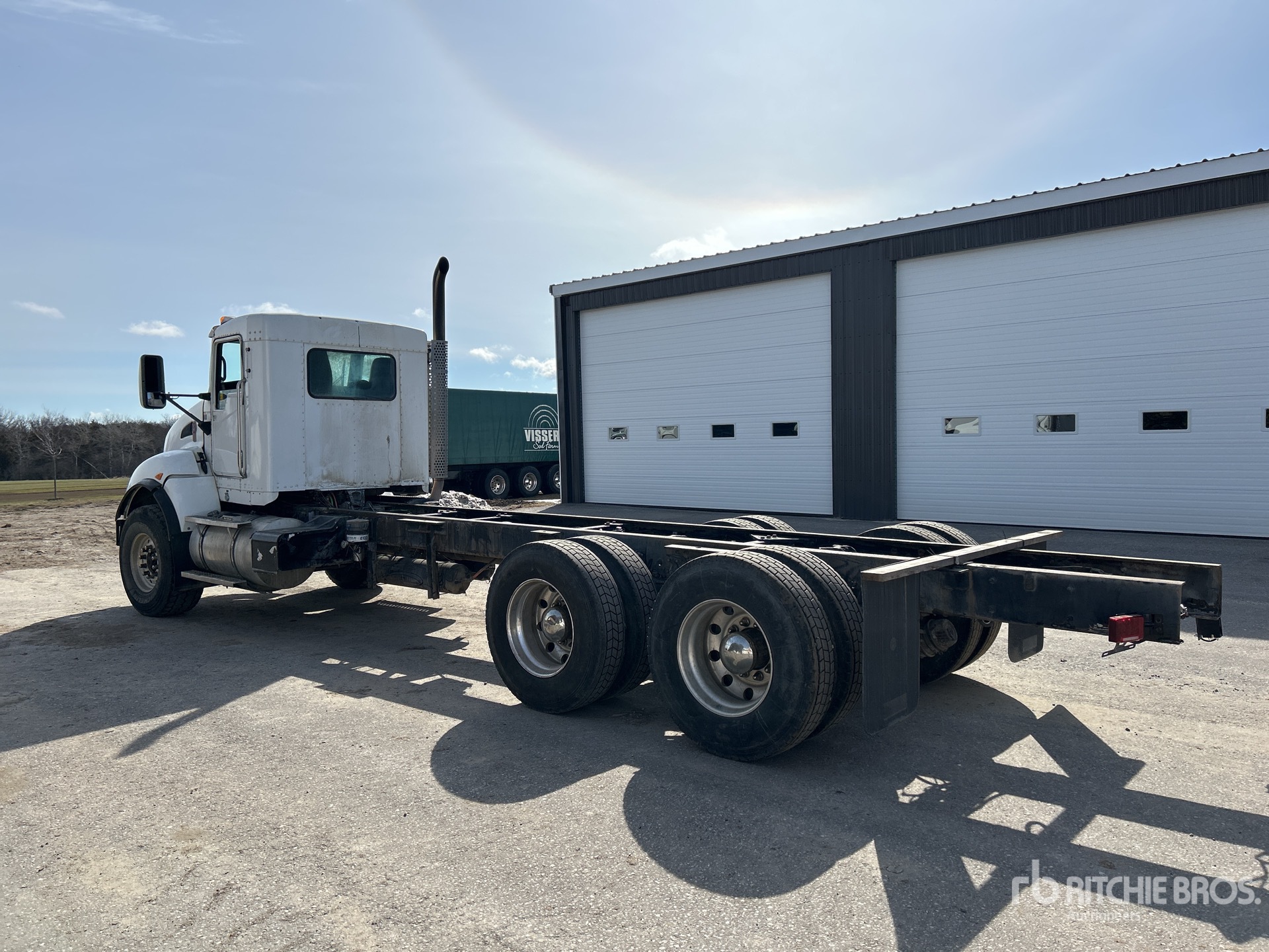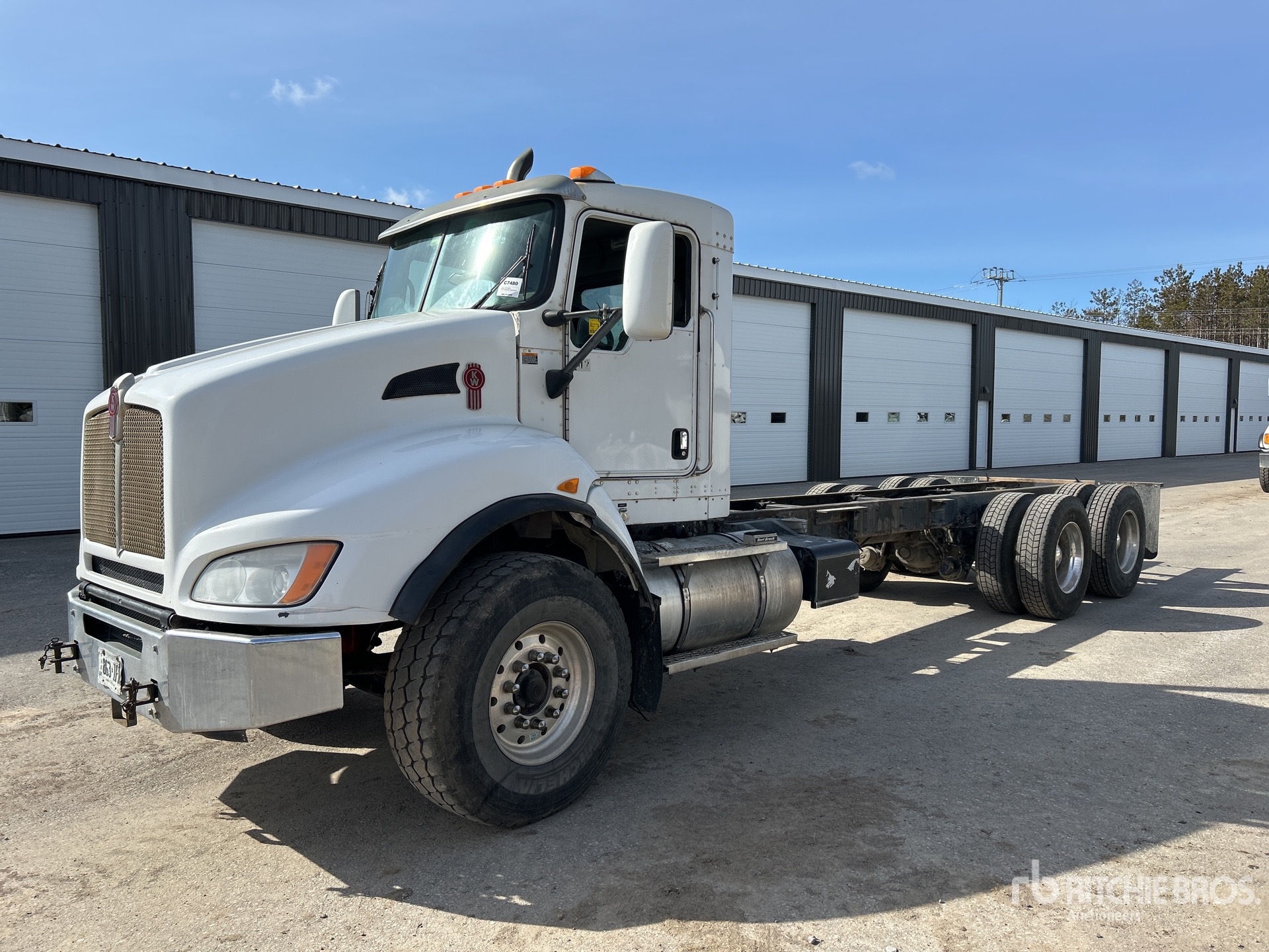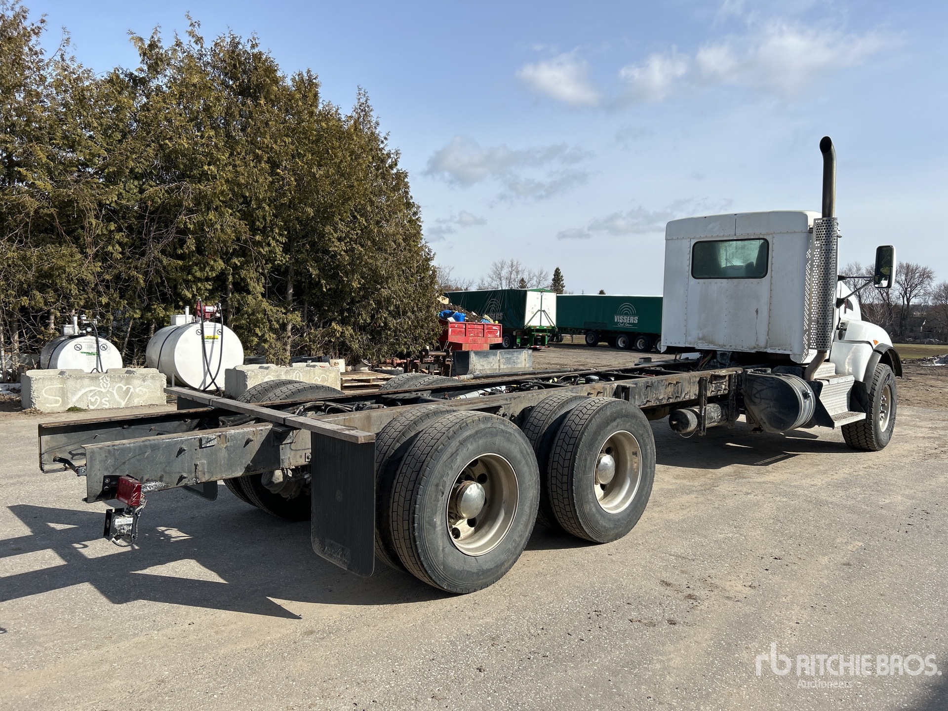 Cummins ISL G 6 Cylinder Diesel Engine, 2012 US EPA Label, Requires Diesel Exhaust Fluid, 14447 Engine hrs, Engine Brake, Eaton Fuller RTO14908LL 8LL Manual Transmission, Double Differential Locks, 9072 kg Front Axle, 20866 kg Rears, Dana D46-170 Drive Axles, 4.10:1 Axle Ratio, 29938 kg GVWR, Air Ride Cab, Aluminum Outer Wheels, 425/65R22.5 Front Tires, 11R22.5 Rear Tires, Dual Steering Boxes, Double Frame, 8-Bag Air Ride Suspension, 244 in Wheelbase, 153 in Cab to Axle, 279 in Cab to End of Frame