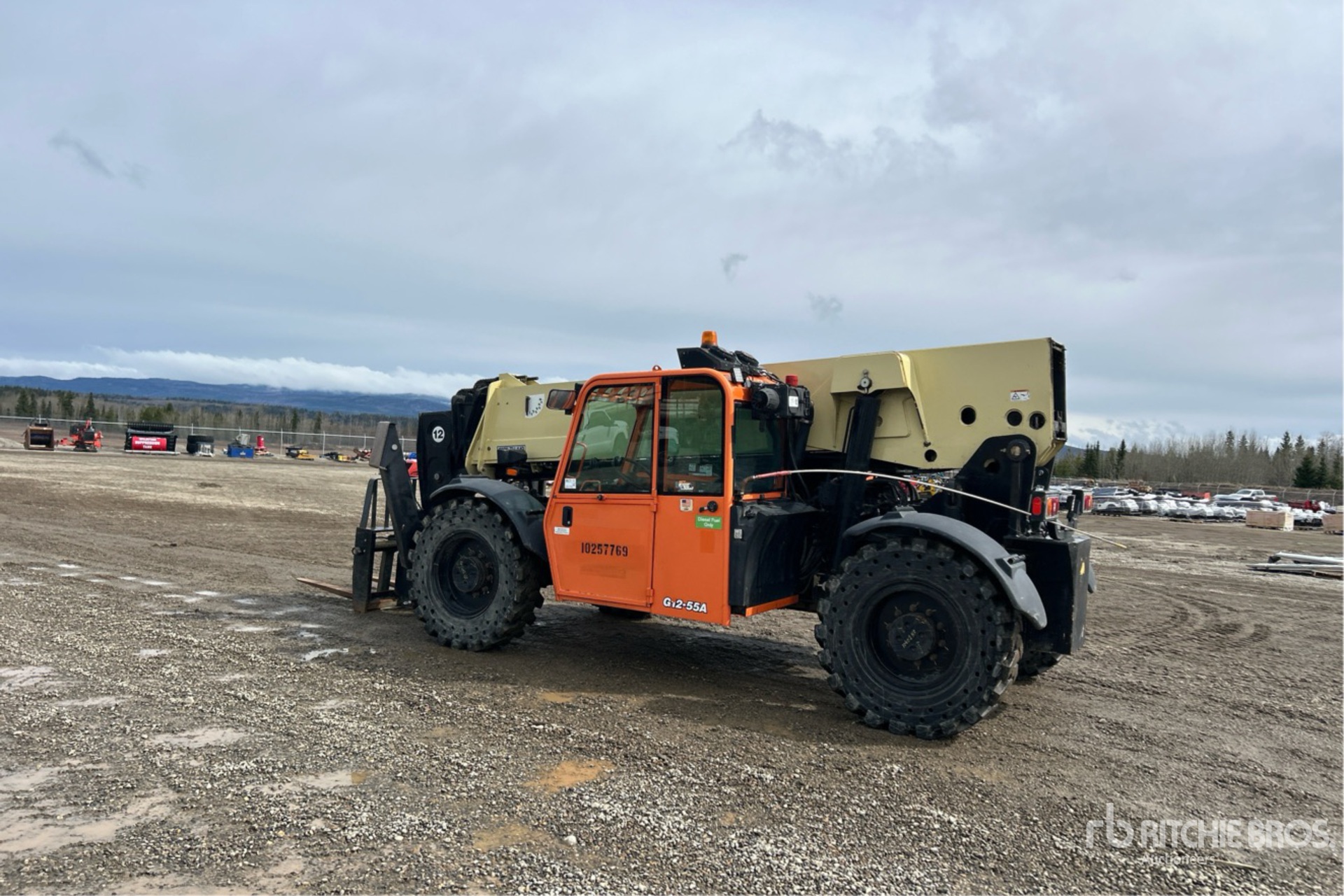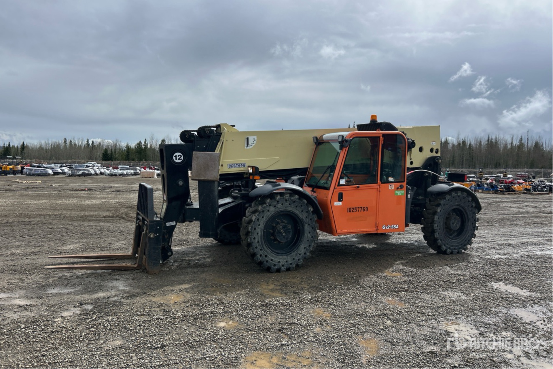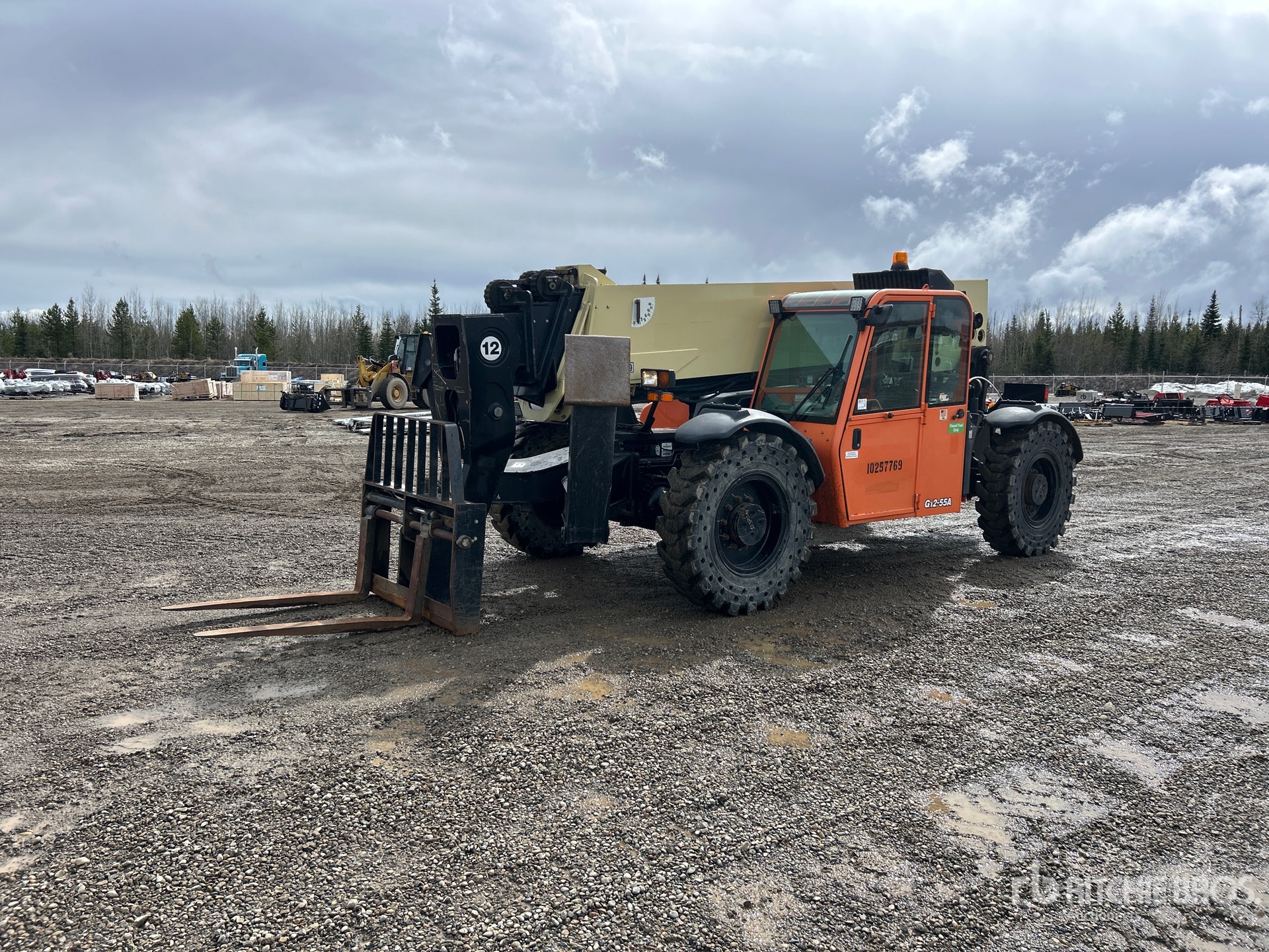 Enclosed Cab, Air Conditioner, 12000 lb Max Lift Capacity, US EPA Label, 47 in Forks, Fork Positioner, Manual Coupler, Outriggers, 13.00-24 Aperture Tires