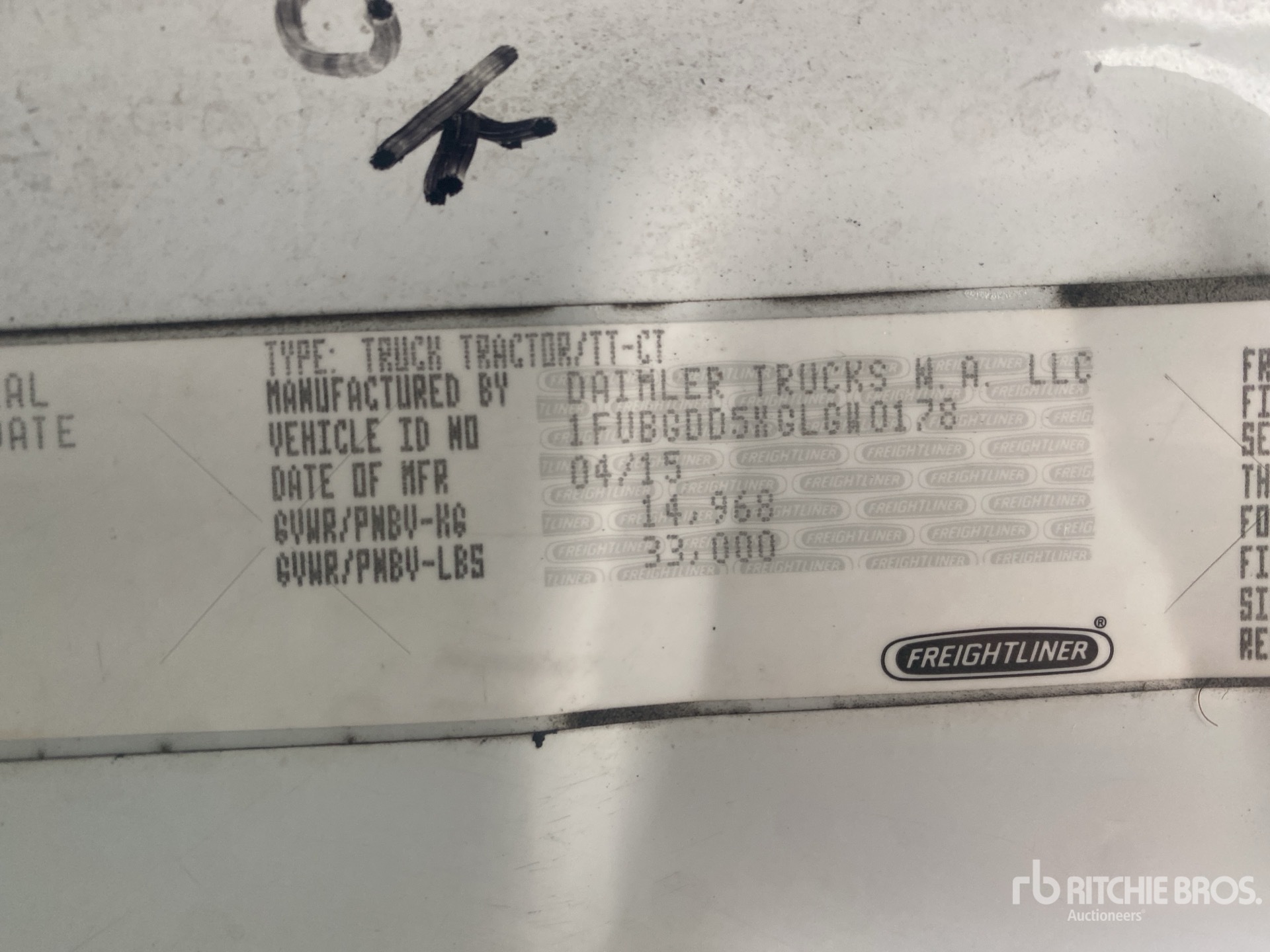 Detroit DD15 505 hp Engine, 2015 US EPA Label, 18308 Engine hrs, Eaton Fuller FRO-15210C 10-Speed Manual Transmission, 12000 lb Front Axle, 21000 lb Rears, 33000 lb GVWR, Engine Brake, 158 in Wheelbase, Air Suspension, 11R22.5, Air Sliding 5th Wheel, Dual Fuel Tanks