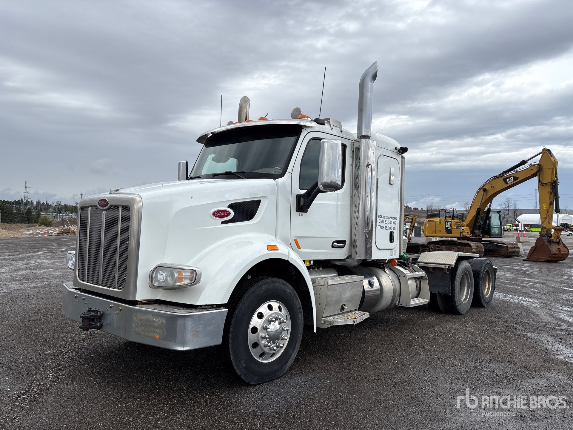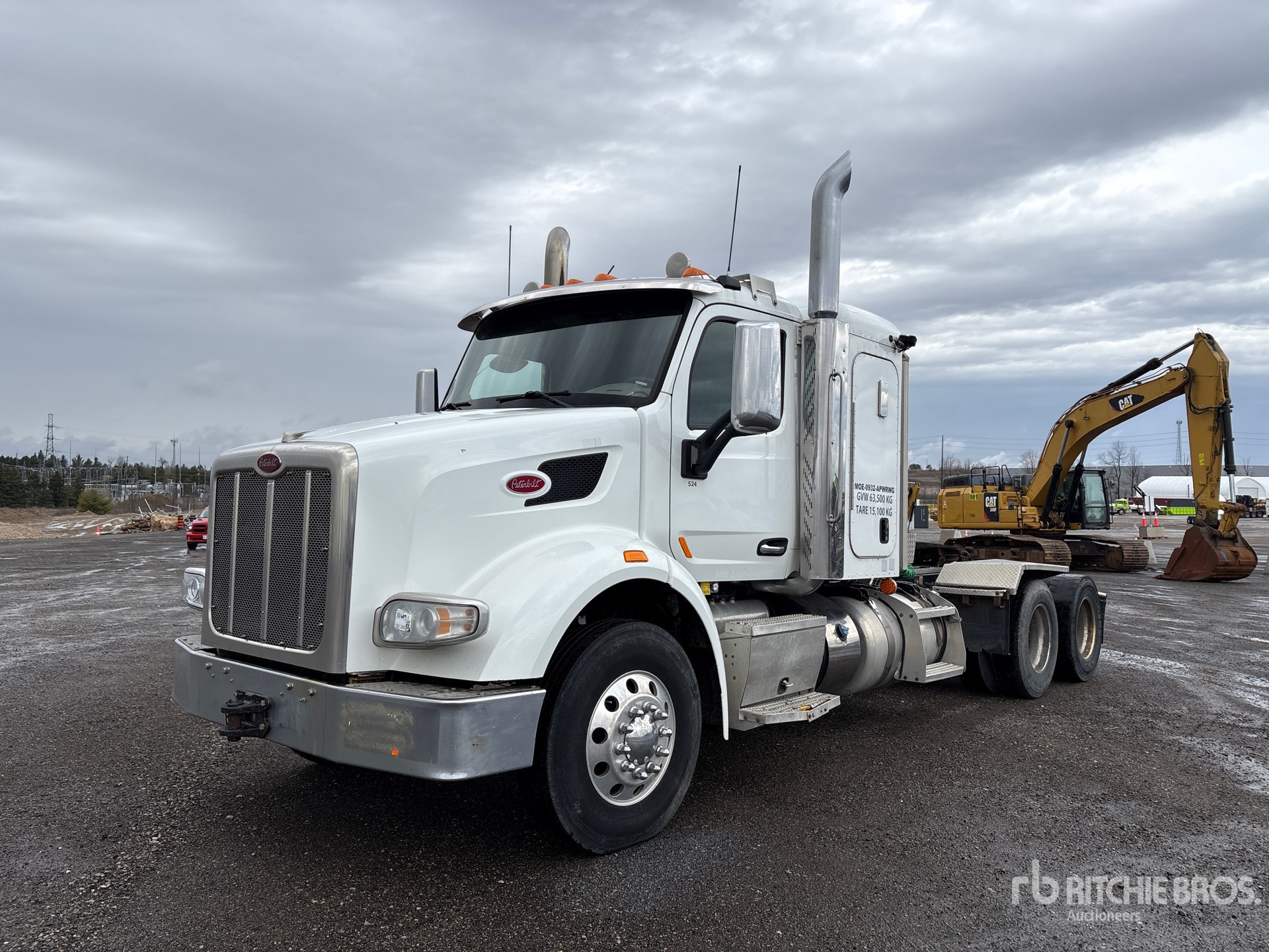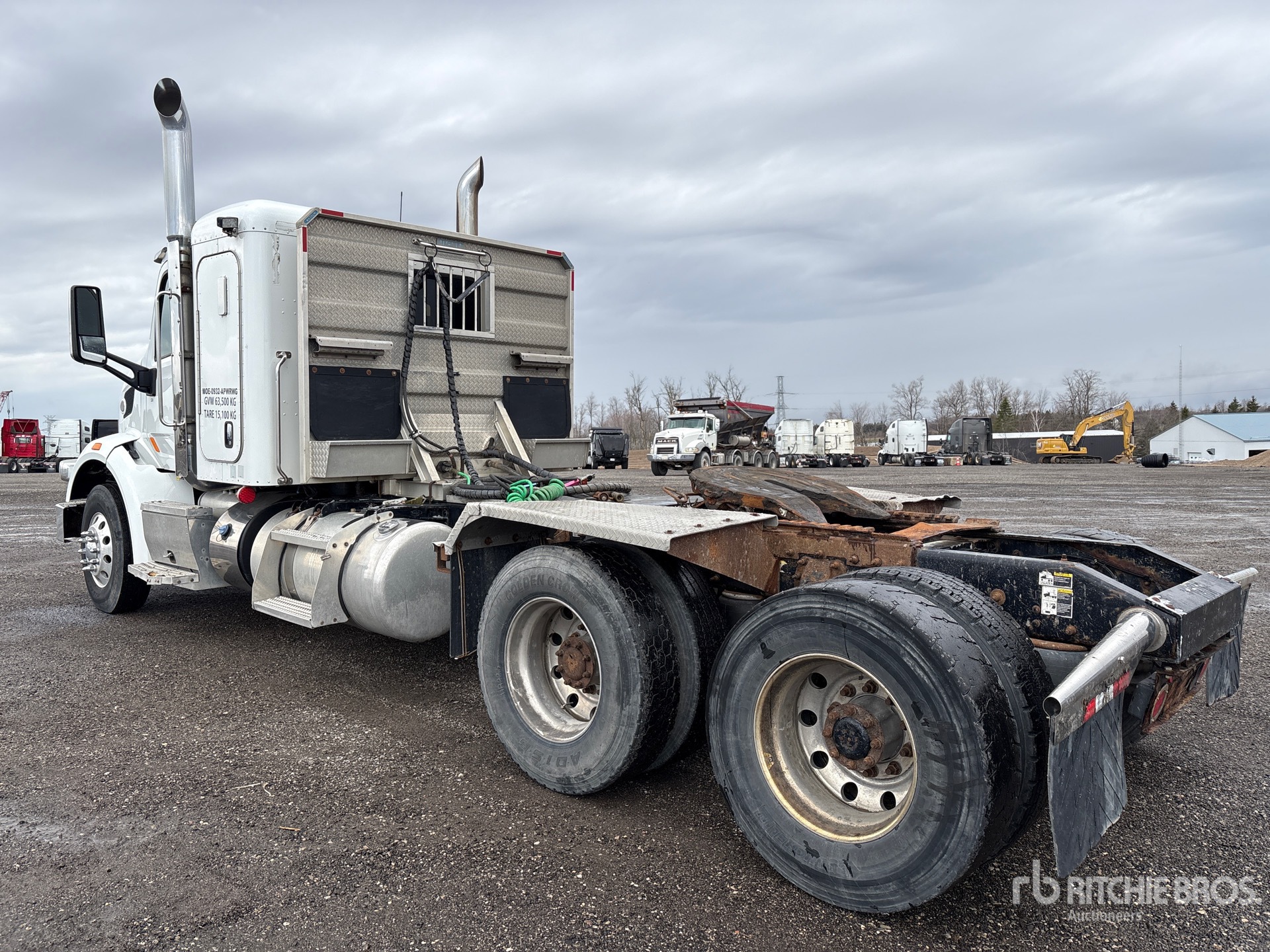 Located in Lane 9 Spot 22, Paccar MX-13 500 hp Engine, 2015 US EPA Label, 3569 Engine hrs, Eaton Fuller Manual Transmission, 14600 lb Front Axle, 46000 lb Rears, 60600 lb GVWR, Engine Brake, Double Differential Locks, 44 in Flat Top Sleeper Cab, 233 in Wheelbase, Air Suspension, Aluminum Wheels, 11R22.5, Air Sliding 5th Wheel, Dual Fuel Tanks, Headache Rack