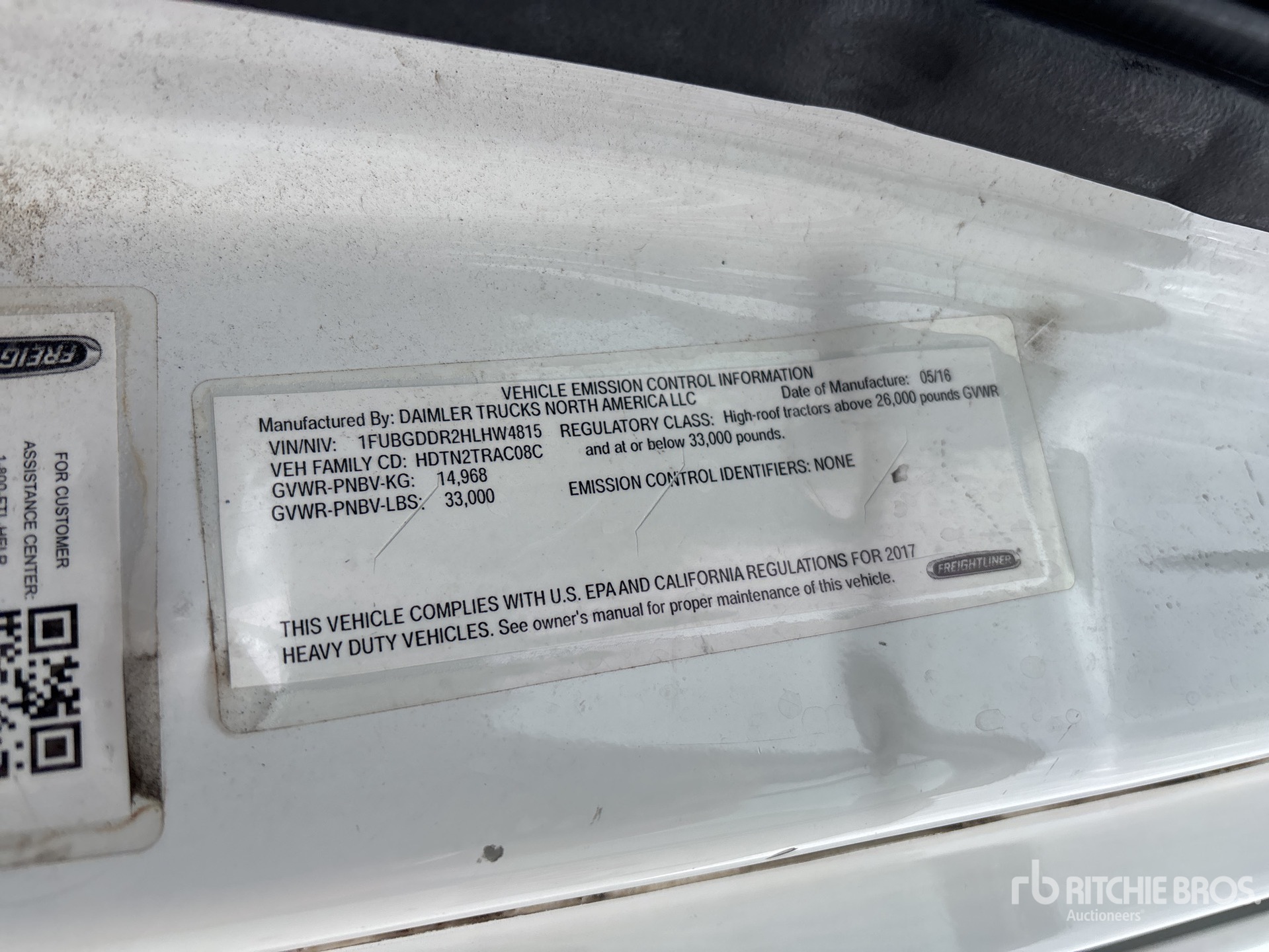 Detroit DD15 455 hp Engine, 2016 US EPA Label, 19308 Engine hrs, Eaton Fuller FRO-15210C 10-Speed Manual Transmission, 12000 lb Front Axle, 21000 lb Rears, 33000 lb GVWR, Engine Brake, 158 in Wheelbase, Air Suspension, 11R22.5, Dual Fuel Tanks