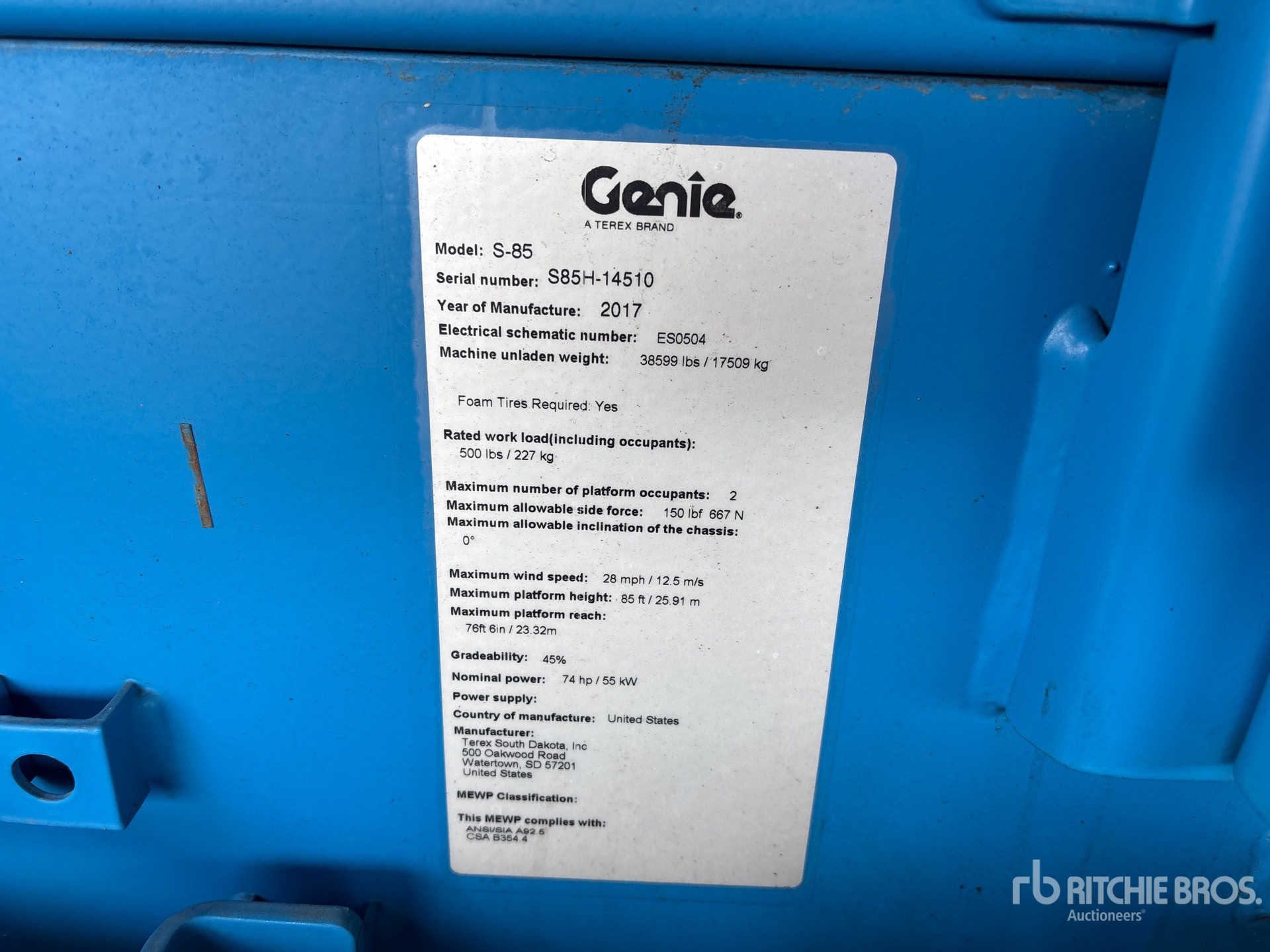 85 ft Max Platform Height, 500 lb Max Weight Capacity, Jib, Power to Platform, 2017 US EPA Label, CARB Compliant, Deutz TD 2.9 L4 4 Cylinder 74 hp 2.925 L Diesel Engine, 18-625 NHS Tires