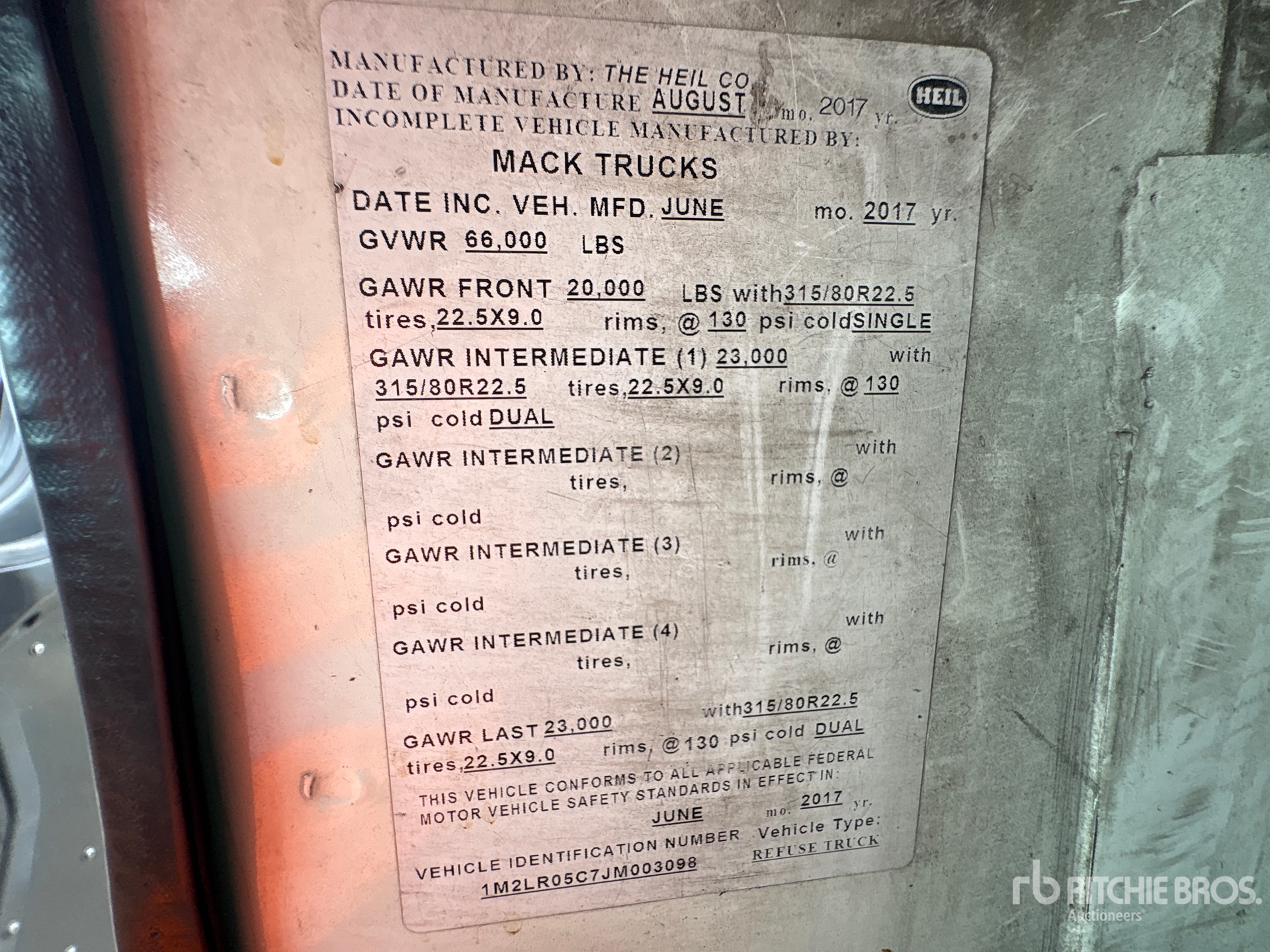 Mack MP7 6 Cylinder Diesel Engine, 2017 US EPA Label, Requires Diesel Exhaust Fluid, 315/80R22.5, 216 in Wheelbase, Heil Collection Body, Grapple Boom Loader