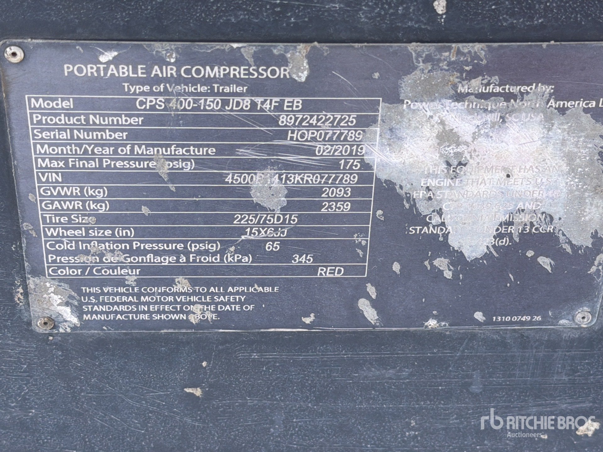 Air Cooler, 175 psi Working Pressure, 2019 US EPA Label, John Deere 4 Cylinder Diesel Engine, Requires AdBlue, Lunette Ring Carrier Trailer, Surge Brakes, Equipment-from-Herc-Rentals