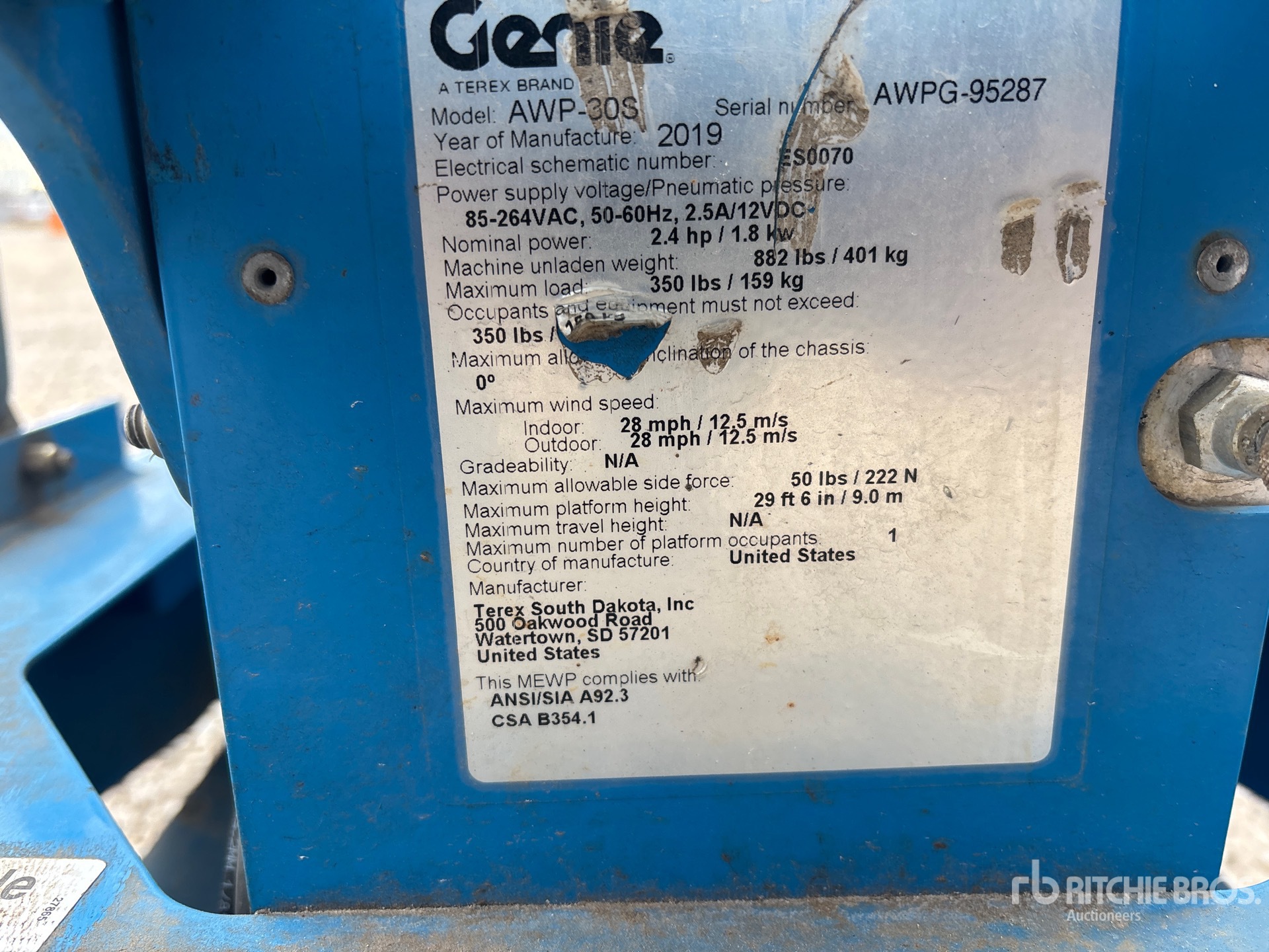 29 ft 6 in Max Platform Height, 350 lb Max Weight Capacity, Power to Platform, Power Inverter, Stabilizers, Solid Non-Marking Tires, Upper Control Box