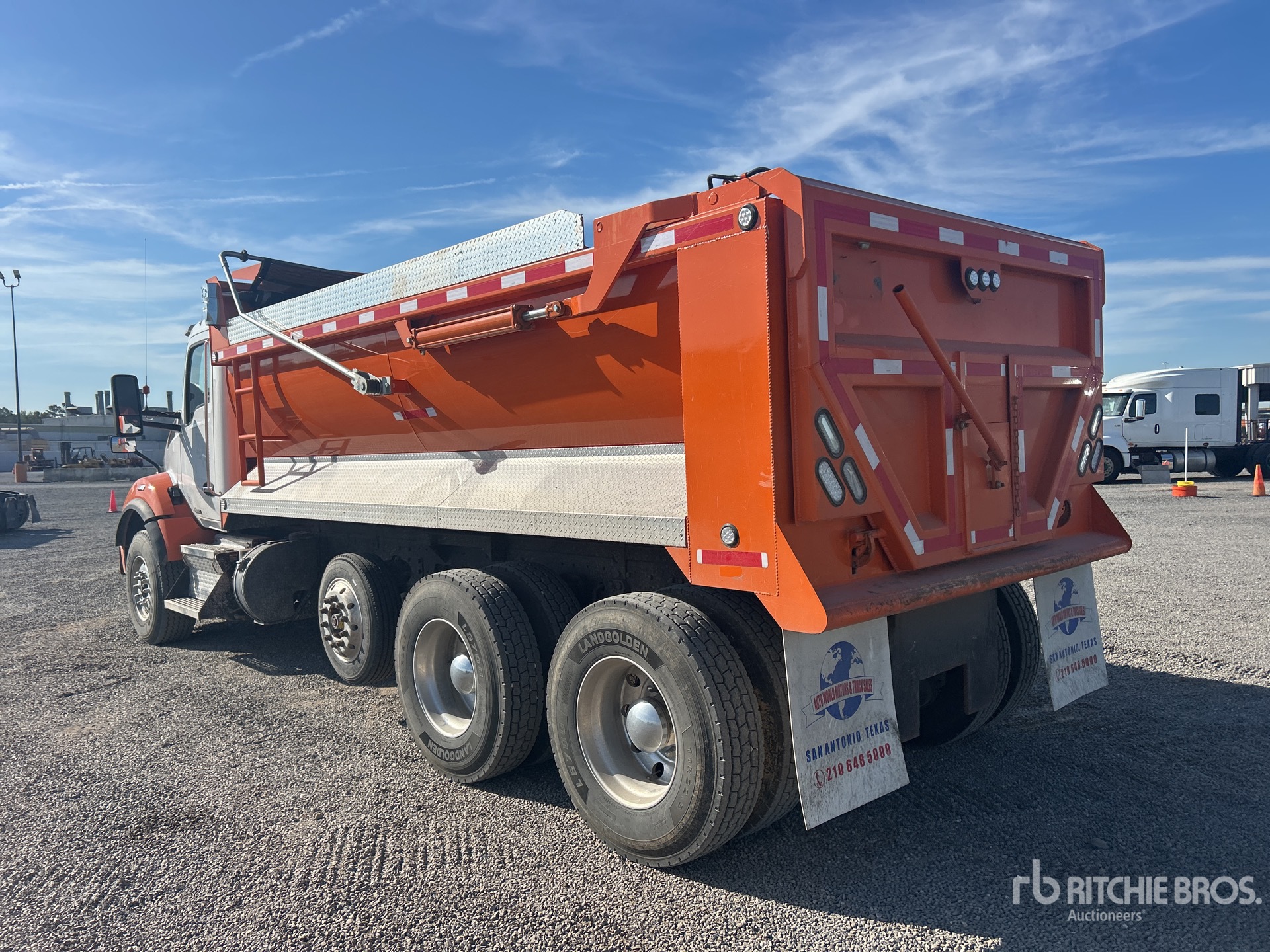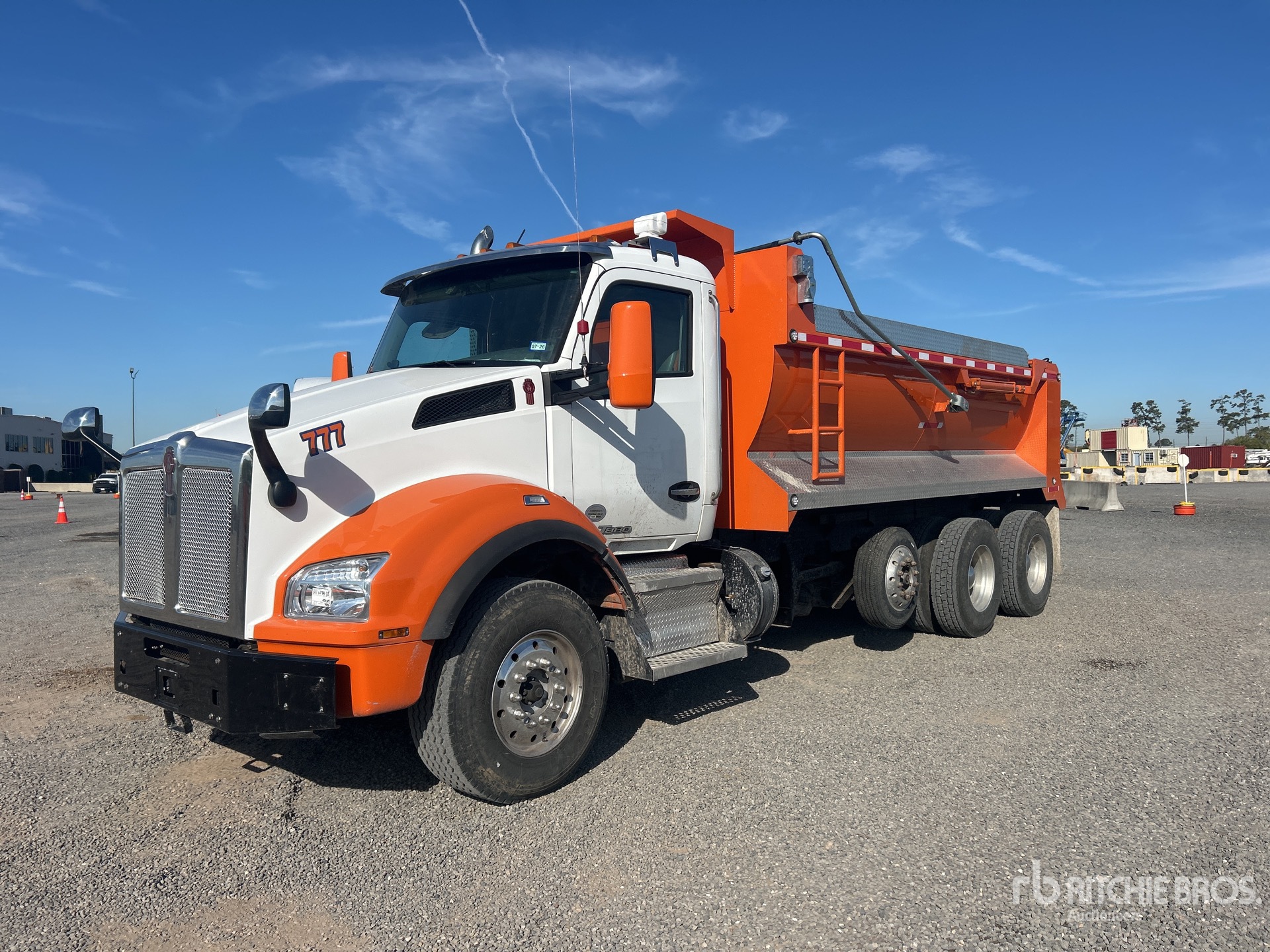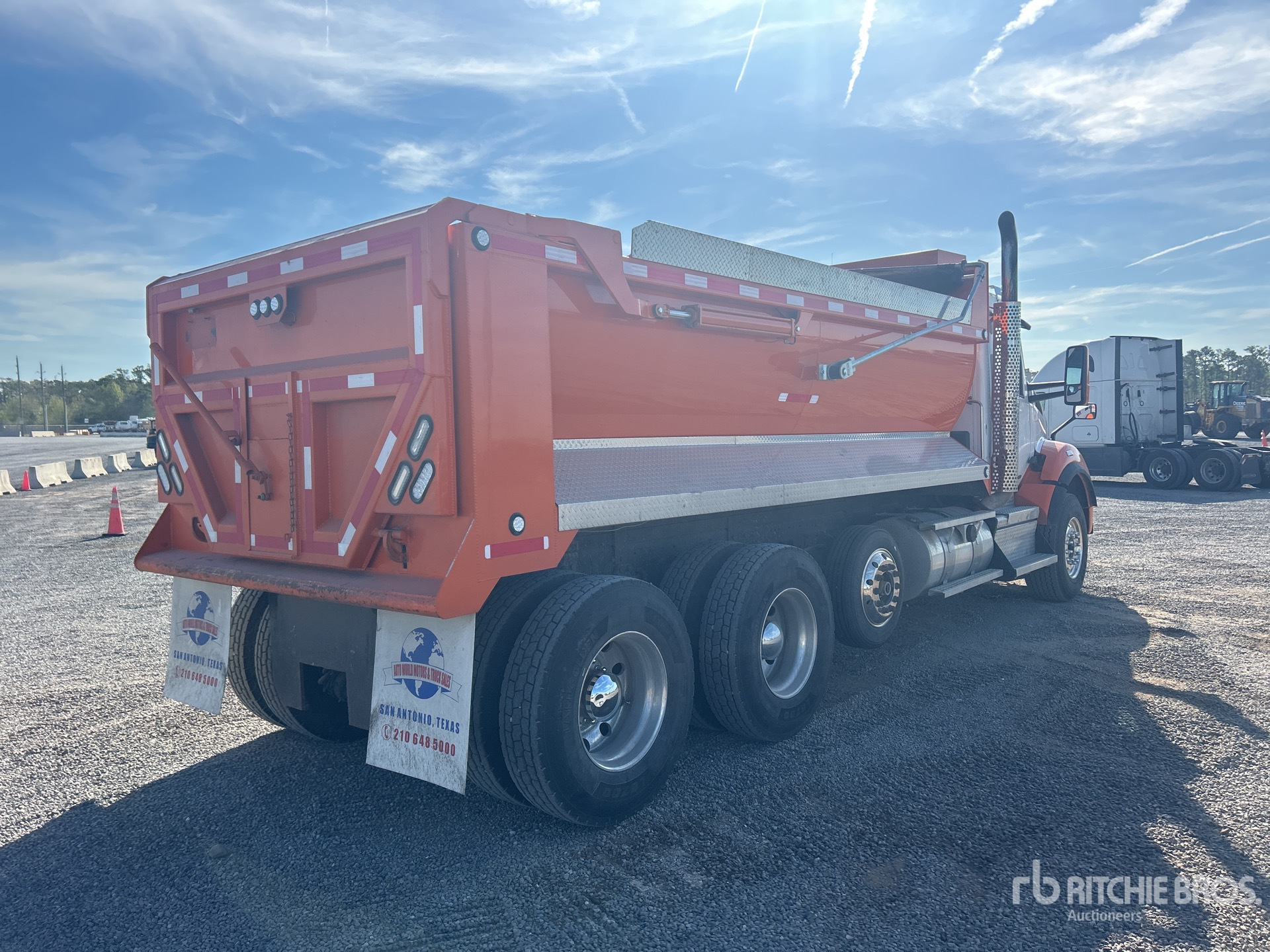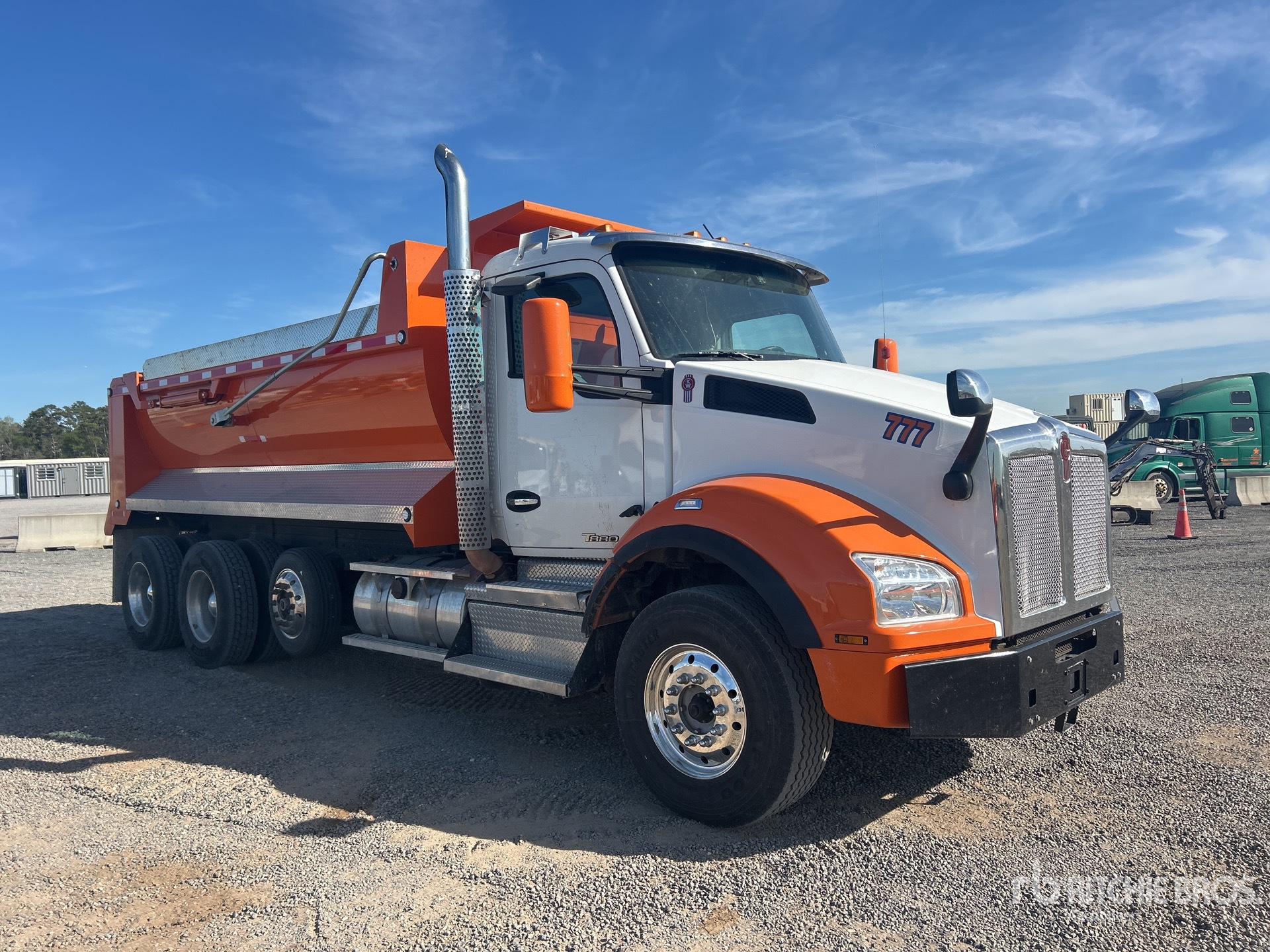 Paccar 6 Cylinder Diesel 400 hp Engine, 2019 US EPA Label, Requires Diesel Exhaust Fluid, Engine Brake, Paccar PO-16F112 Automated Transmission, Double Differential Locks, 13200 lb Front Axle, 40000 lb Rears, Meritor MP-40-14X4 Drive Axles, 3.55:1 Axle Ratio, 53200 lb GVWR, Air Ride Cab, Aluminum Outer Wheels, 385/65R22.5 Front Tires, 11R22.5 Rear Tires, Steerable Air Lift Pusher Axle, Double Frame, 8-Bag Air Ride Suspension, 238 in Wheelbase, 17 ft 3 in Long x 4 ft 5 in High Steel Body, Round Bottom, Electric Roll Tarp, High-Lift Tailgate, Tailgate Chute