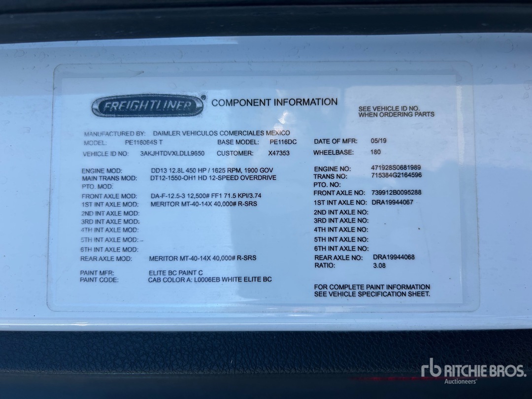 Detroit DD13 450 hp Engine, 13517.54 Engine hrs, Detroit DT12-1550-OH1 12-Speed Automated Transmission, 12350 lb Front Axle, 40000 lb Rears, 52350 lb GVWR, Engine Brake, 180 in Wheelbase, Air Suspension, Aluminum Wheels, 275/80R22.5, Air Sliding 5th Wheel
