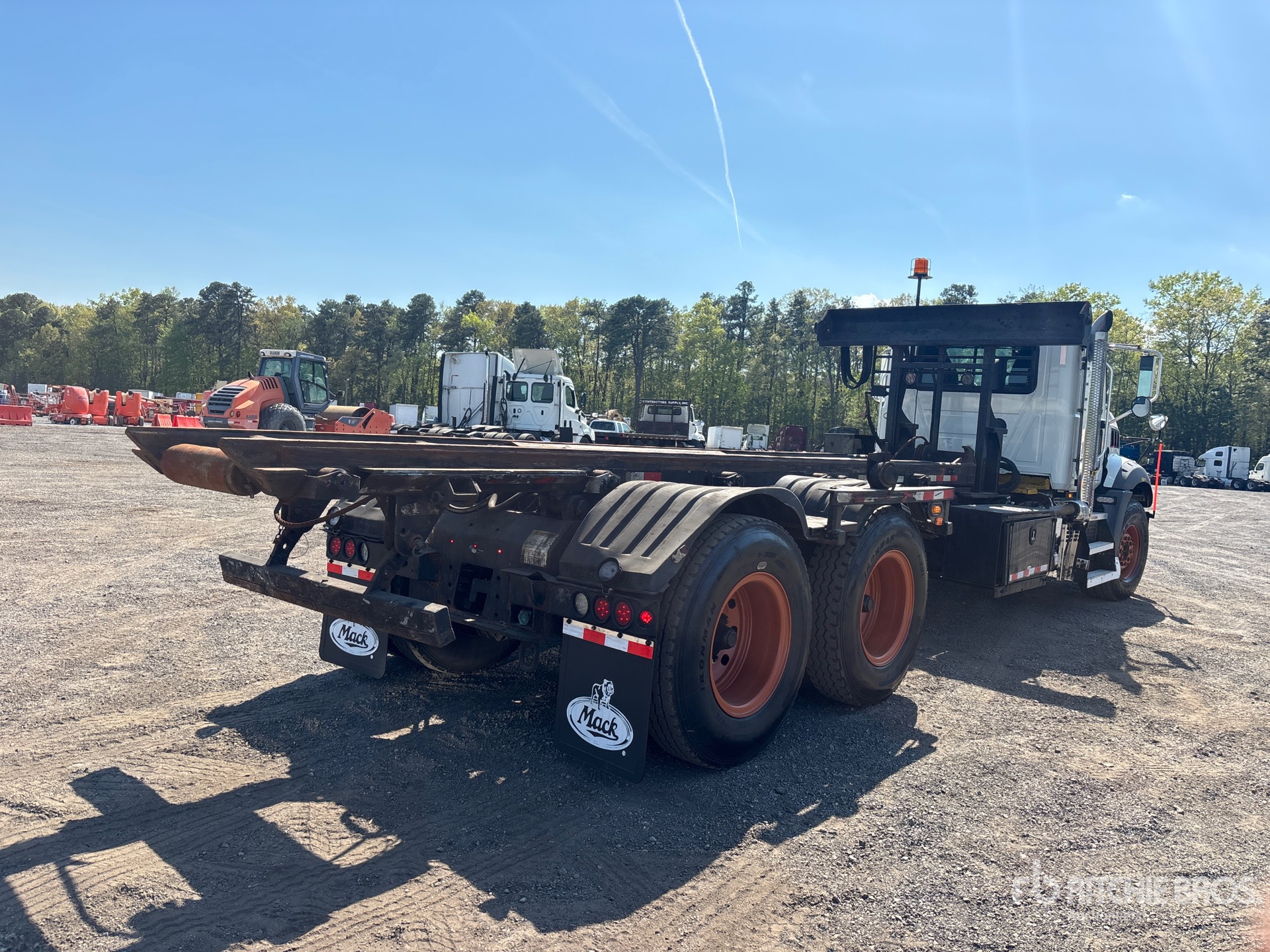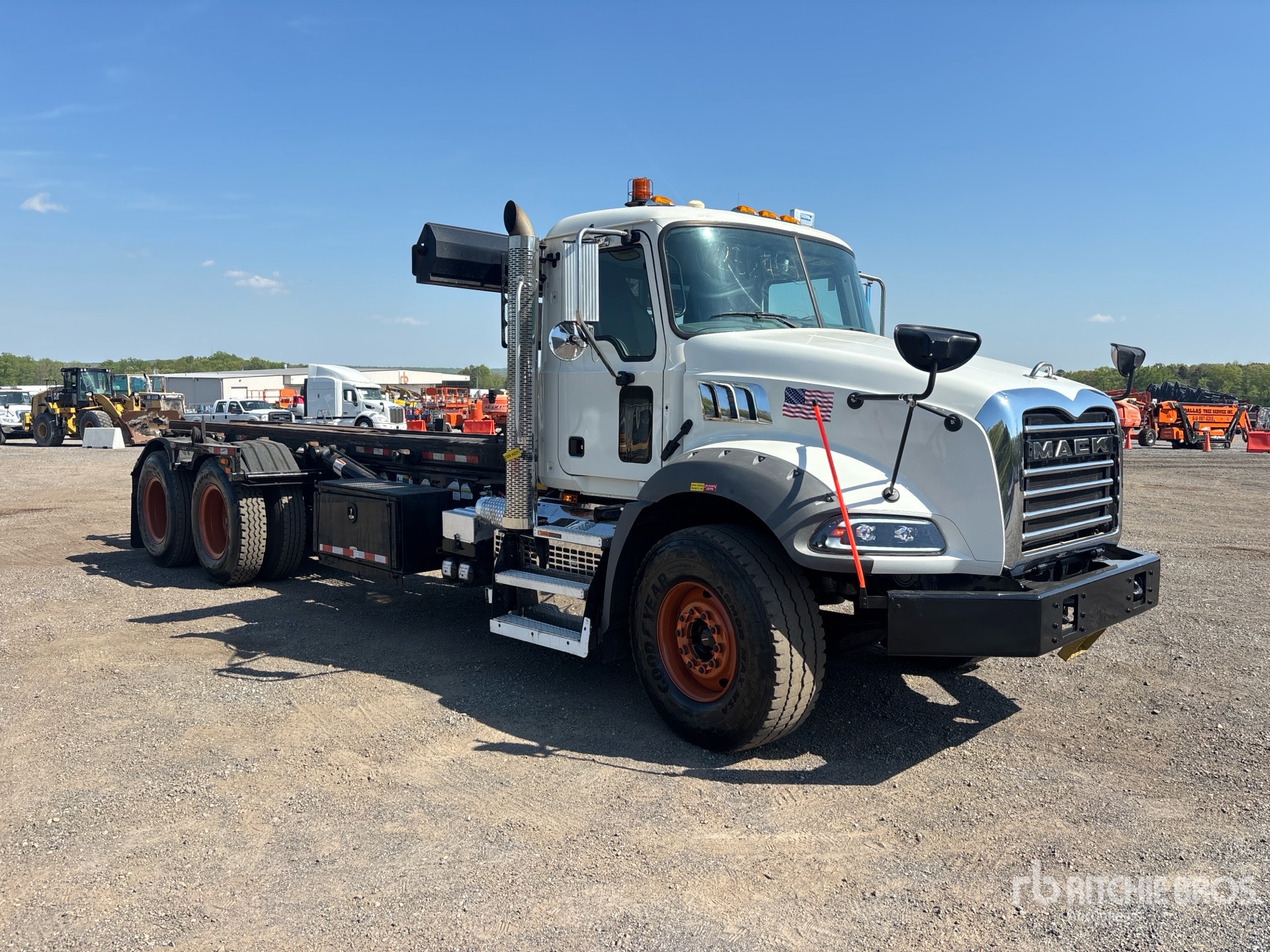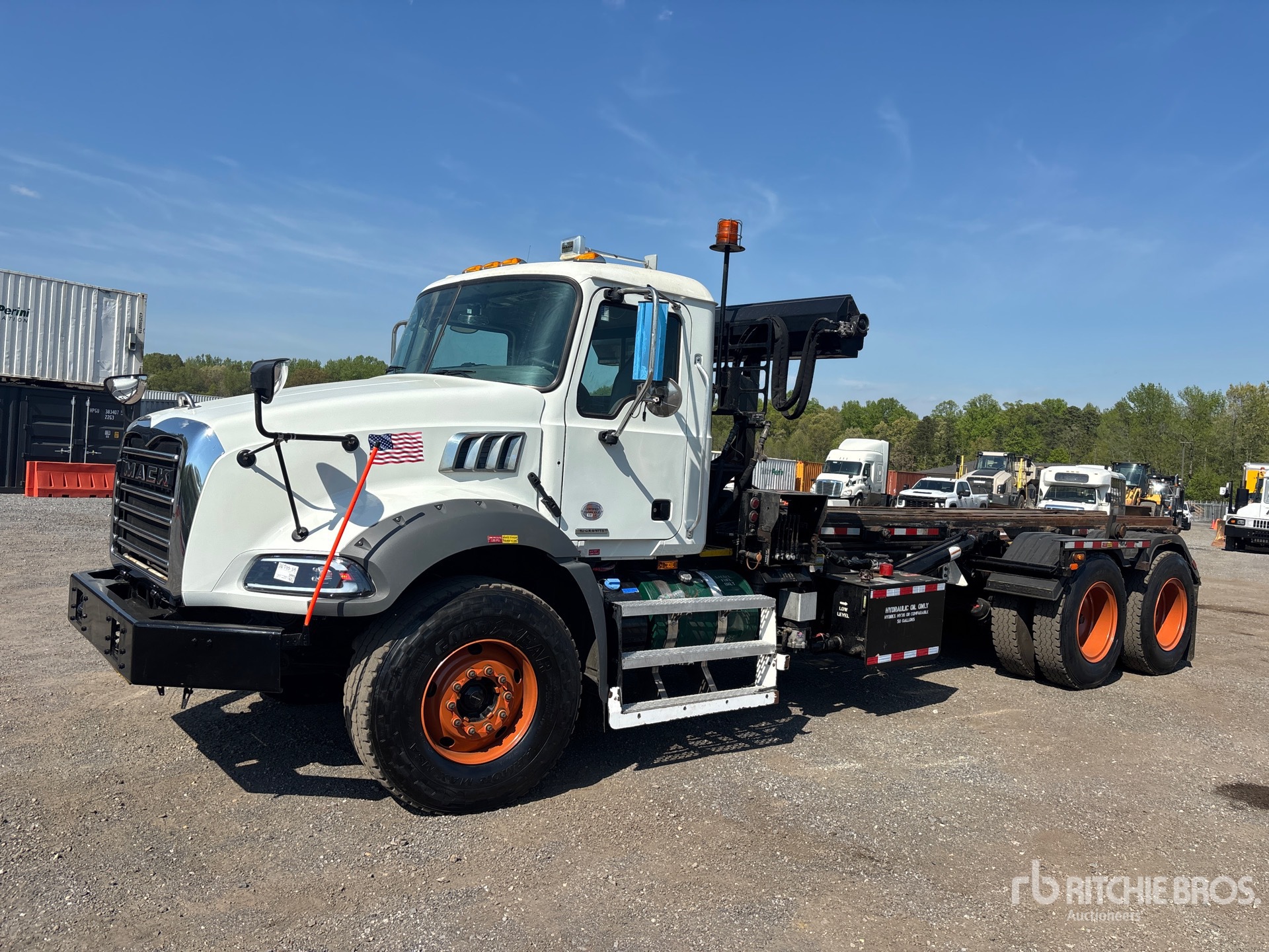 Mack MP8 6 Cylinder Diesel Engine, Requires Diesel Exhaust Fluid, 8519 Engine hrs, Allison Automatic Transmission, 20000 lb Front Axle, 65000 lb Rears, 85000 lb GVWR, 12R24.5 Front Tires, 12R22.5 Rear Tires, Spring Suspension, 264 in Wheelbase, PTO, 2020 Galbreath Roll-Off Body, Outside Rail, 20 ft Hoist, Winch