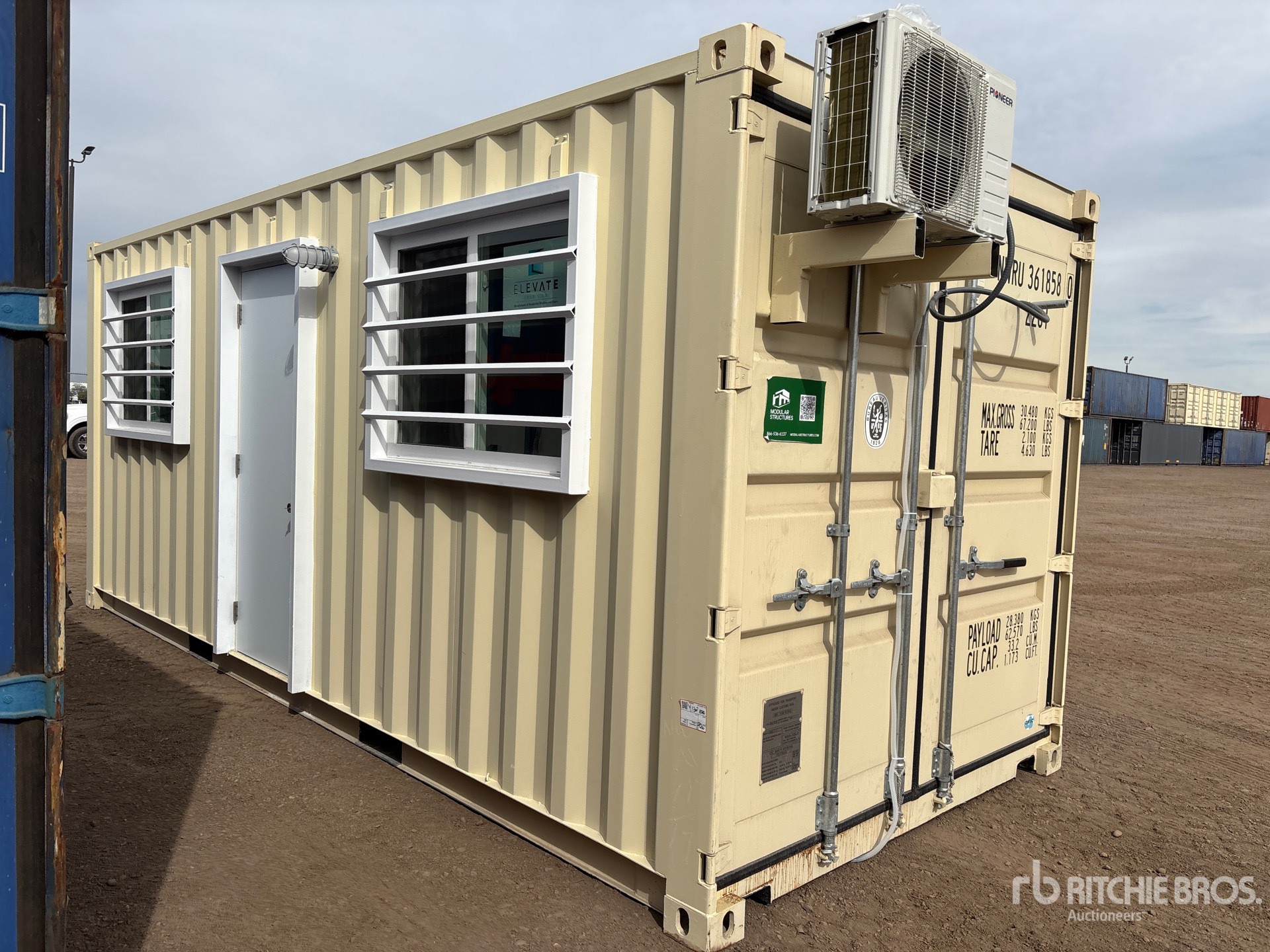 20' x 8', 8' 6" High, (1) Swing-Out Door, (2) Windows w/Security Bars, Fork Pockets, Laminate Flooring, SunScreen, R13 Insulation, (1) Pioneer HVAC Mini-Split, (1) Electric Panel, LED Ceiling Lights, Interior Outlets, Wiring done to National Electric Code (NEC)