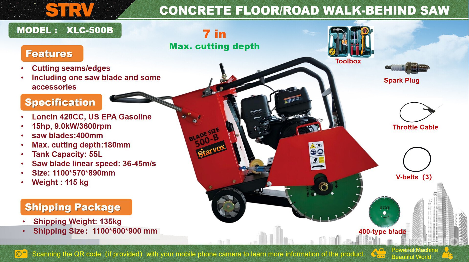 15 in Max Blade Diameter, 7 in Max Cutting Depth, Manual Blade Raise / Lower, Loncin 1 Cylinder 15 hp Gasoline Engine, Product images displayed are stock photos. Item is new/unused.