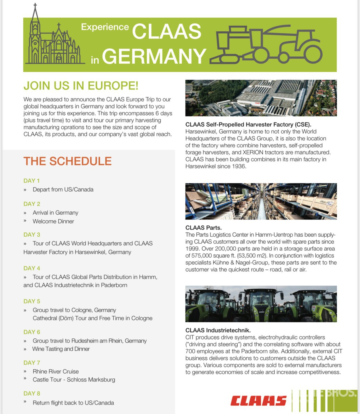 Claas is pleased to announce the CLAAS Europe Trip to their global headquarters in Germany. This trip encompasses 6 days (plus travel time) to visit and tour their primary harvesting manufacturing operations. Tentatively February 21-February 28, 2026 *subject to change* Hotels & Transportation included Flights NOT included $500 Uniglobe Travel Voucher Schedule: Day 1 - Depart from Canada Day 2 - Arrival in Frankfurt, Germany & Welcome Dinner Day 3 - Tour of CLAAS World Headquarters & CLAAS Havester Factory in Harsewinkel, Geramy Day 4 - Tour of CLAAS Global Parts Distribution in Hamm, and CLAAS Industrietechnik in Paderborn Day 5 - Group travel to Cologne, Germany, Cathedral (Dom) Tour and Free Time in Cologne Day 6 - Group travel to rudesheim am Rhein, Gerany, Wine Tasting and Dinner Day 7 - Rhine River Cruise, Castle Tour - Schloss Marksburg Day 8 - Return Flight back to Canada