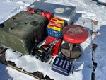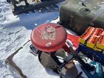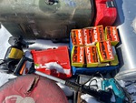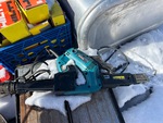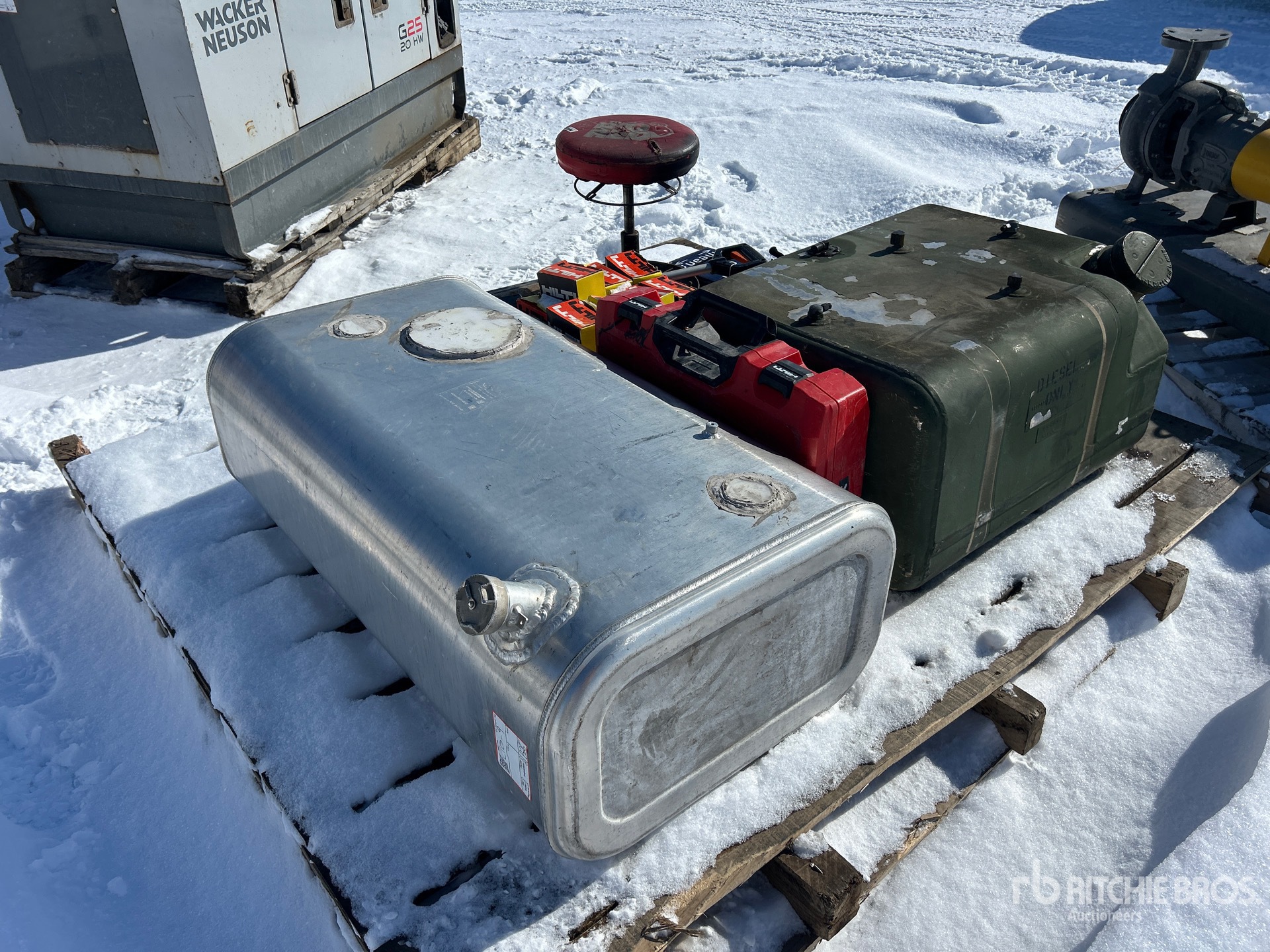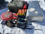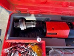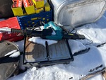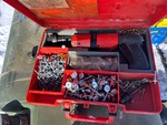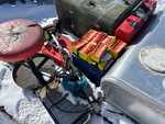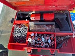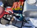 Diesel tank, Makita Nailer, Hilti assorted nails. Hilti Nailer. Metal table saw, table grinder, workshop stool.